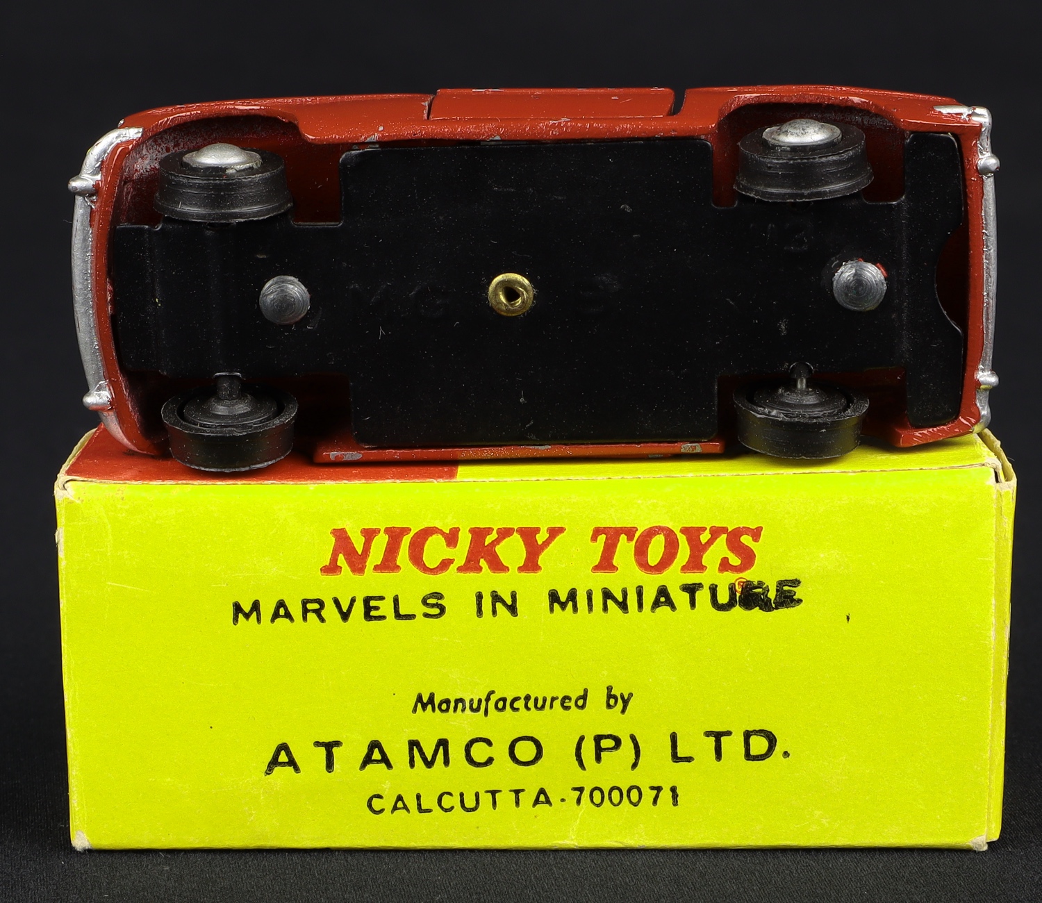 The colourful correct box (ATAMCO P LTD. Calcutta) is complete and brightly-coloured. Barely any of the usual wear – an impressive example. Shop price label on an end flap.