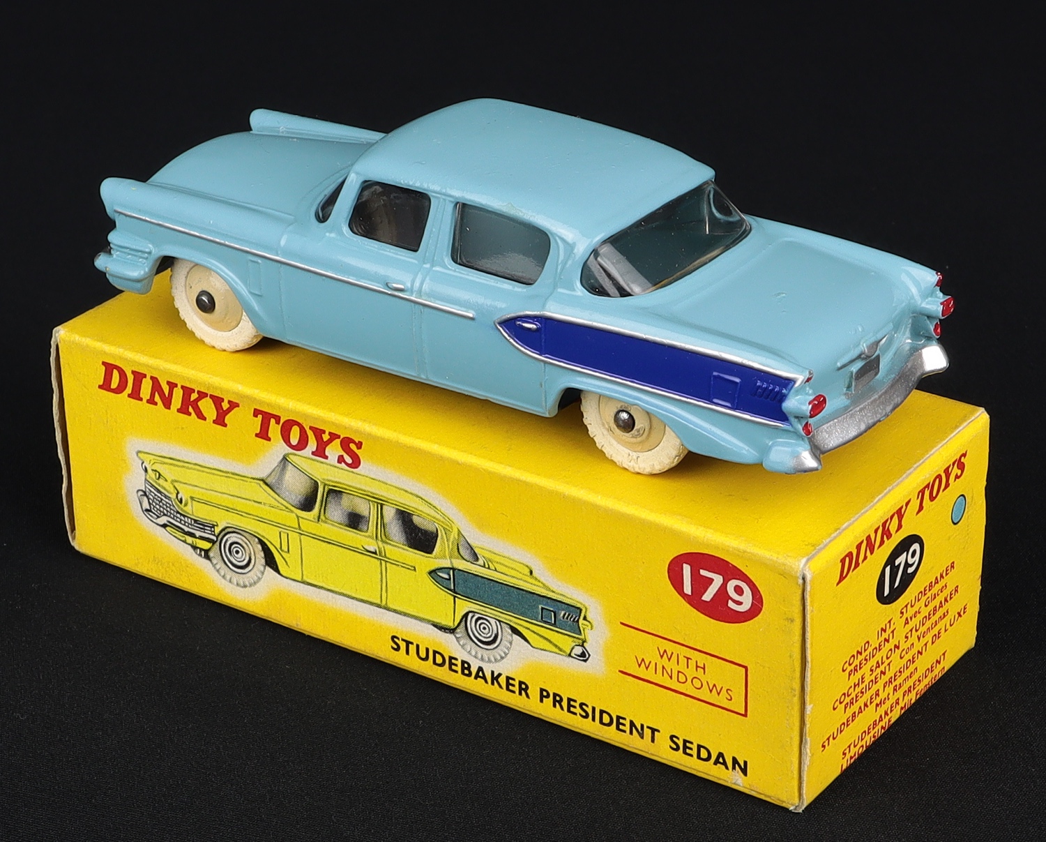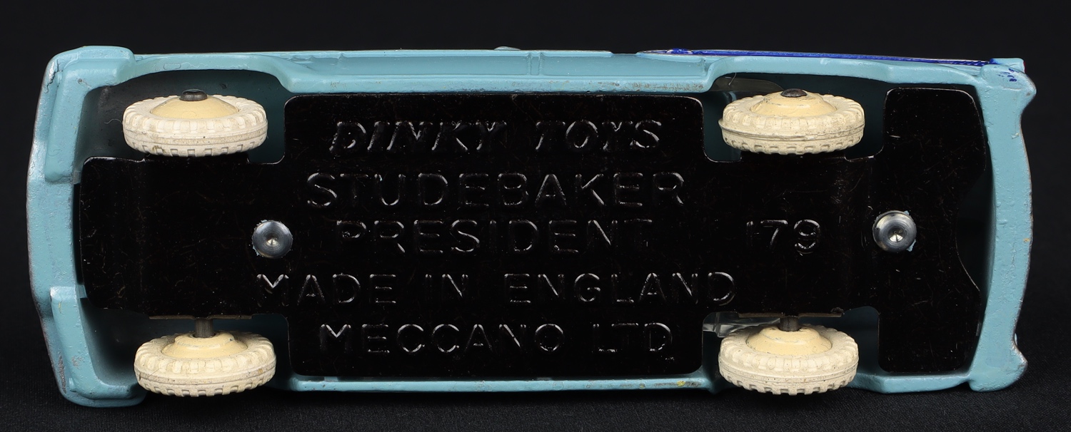 Studebaker President Sedan by Dinky Toys, No. 179. Two-tone blue issue. Very near mint/boxed. Nice box! From The Reference Collection.