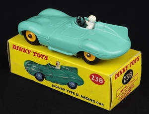 Jaguar 'D' Type Racing Car buy Dinky Toys, No. 238. Very near mint/boxed. Yellow plastic wheels. Scarce issue. Fresh late issue picture box. Starting bid £150. Please note that QDT apply 12.5% buyer's commission.