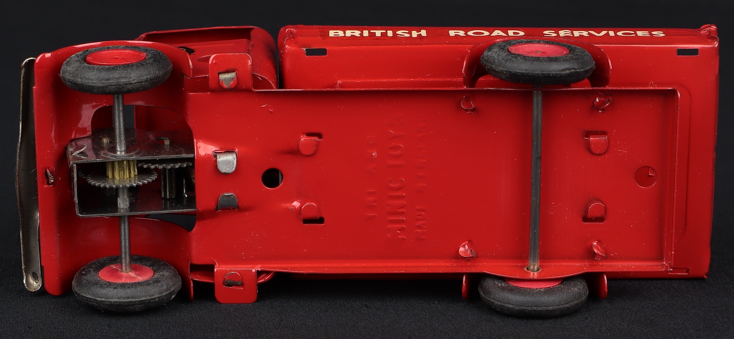 A gleaming Minic model in superb condition. This Post-War Open Lorry is finished in vivid red with a working motor and virtually complete – complete BRITISH ROAD SERVICES lettering and logo on both sides. Red plastic wheels and well-shaped smooth tyres. Shiny chrome.