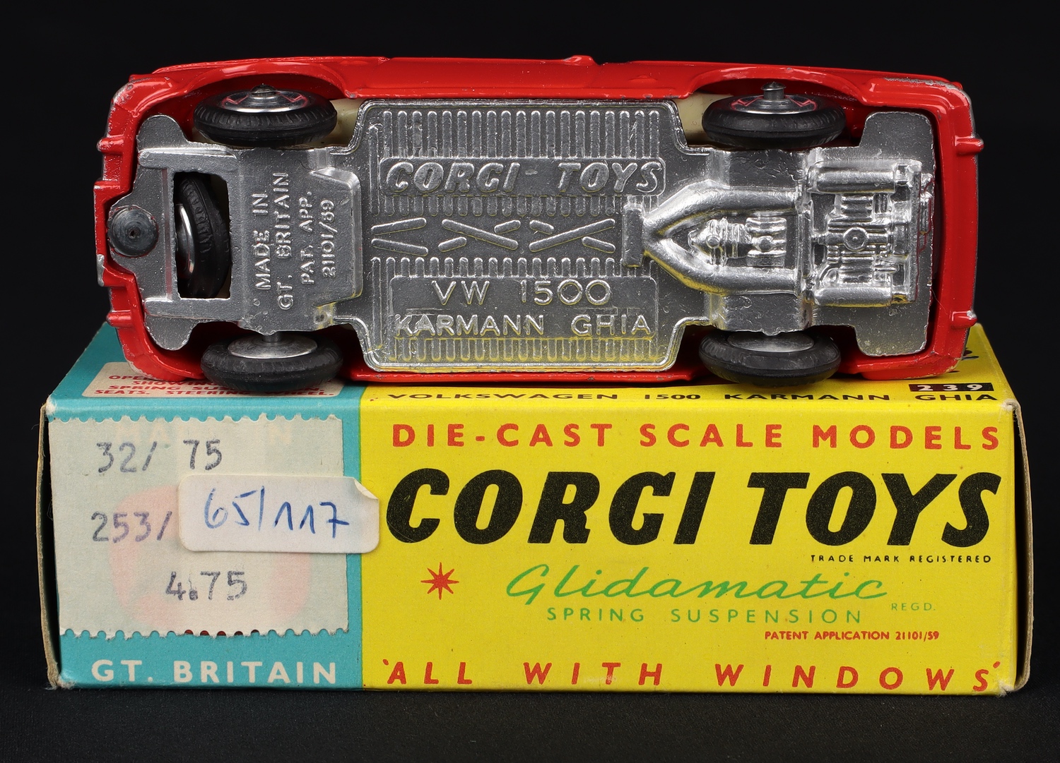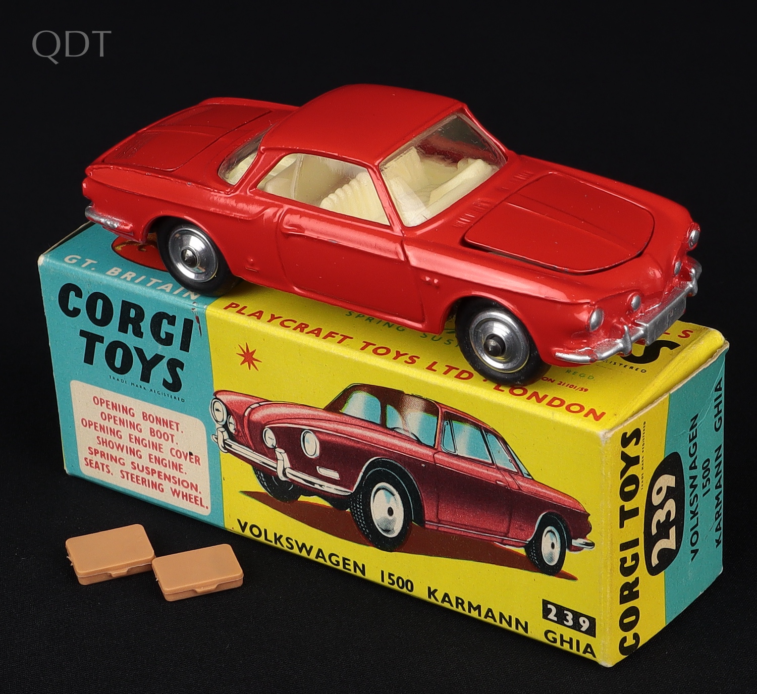 Volkswagen 1500 Karmann Ghia by Corgi Toys, No. 239. Scarlet red issue with CREAM INTERIOR, with 2 pieces of luggage & spare wheel. Very near mint/boxed.