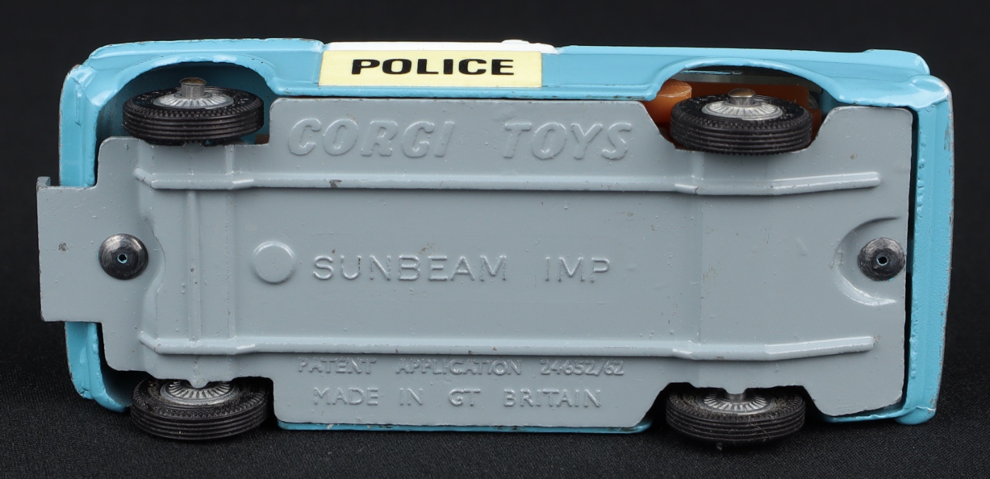 This scarce Police Sunbeam PANDA Imp has a pleasing light blue and white finish with blue roof light, luminous “POLICE” labels on both sides. Jewelled headlights, detailed cast wheels. Original tyres are as-new. Opening rear window and folding rear seat. Notably, suspension is fine. “POLICE” label at front bumper has a little background edge nick. A few tiny marks to the paint finish.