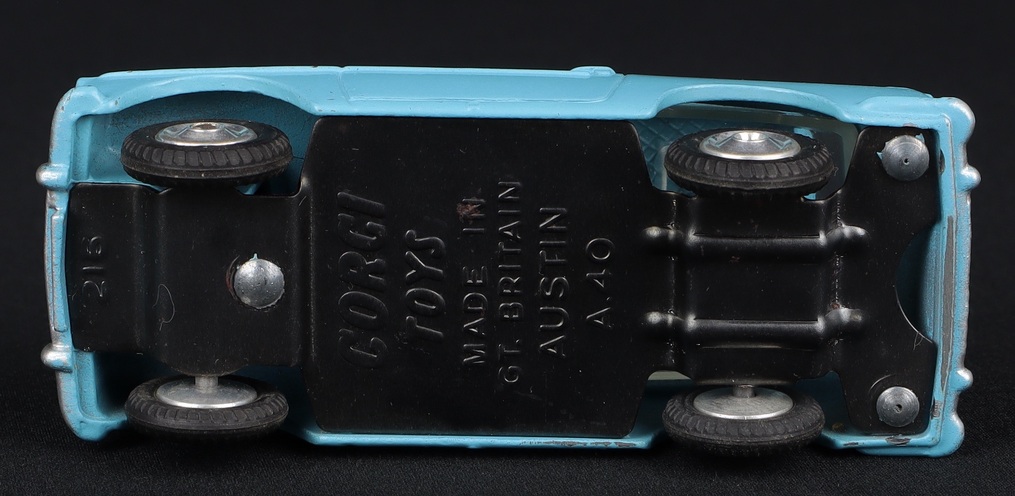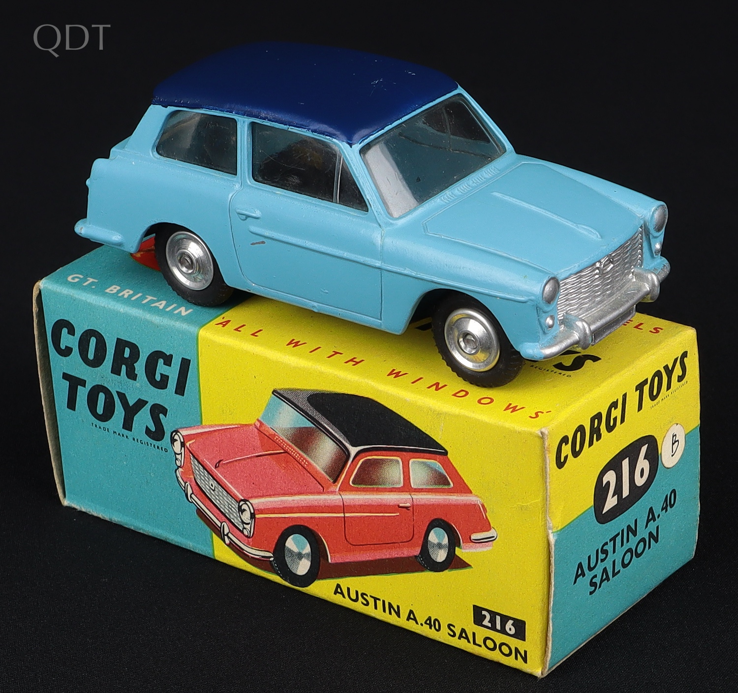 Austin A40 Saloon by Corgi Toys, No. 216. Two-tone blue and a rare find with SHAPED SPUN WHEELS. Near mint plus/boxed. From The 25 Year Collection in California. Starting bid £150. Please note that QDT apply 12.5% buyer's commission.