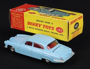 Jaguar Mark X by Dinky Toys, No. 142. Light SKY BLUE version. Near mint plus/boxed. Very rare issue, complete with luggage. From The Hasting Collection. Starting bid £500. Please note that QDT apply 12.5% buyer's commission.