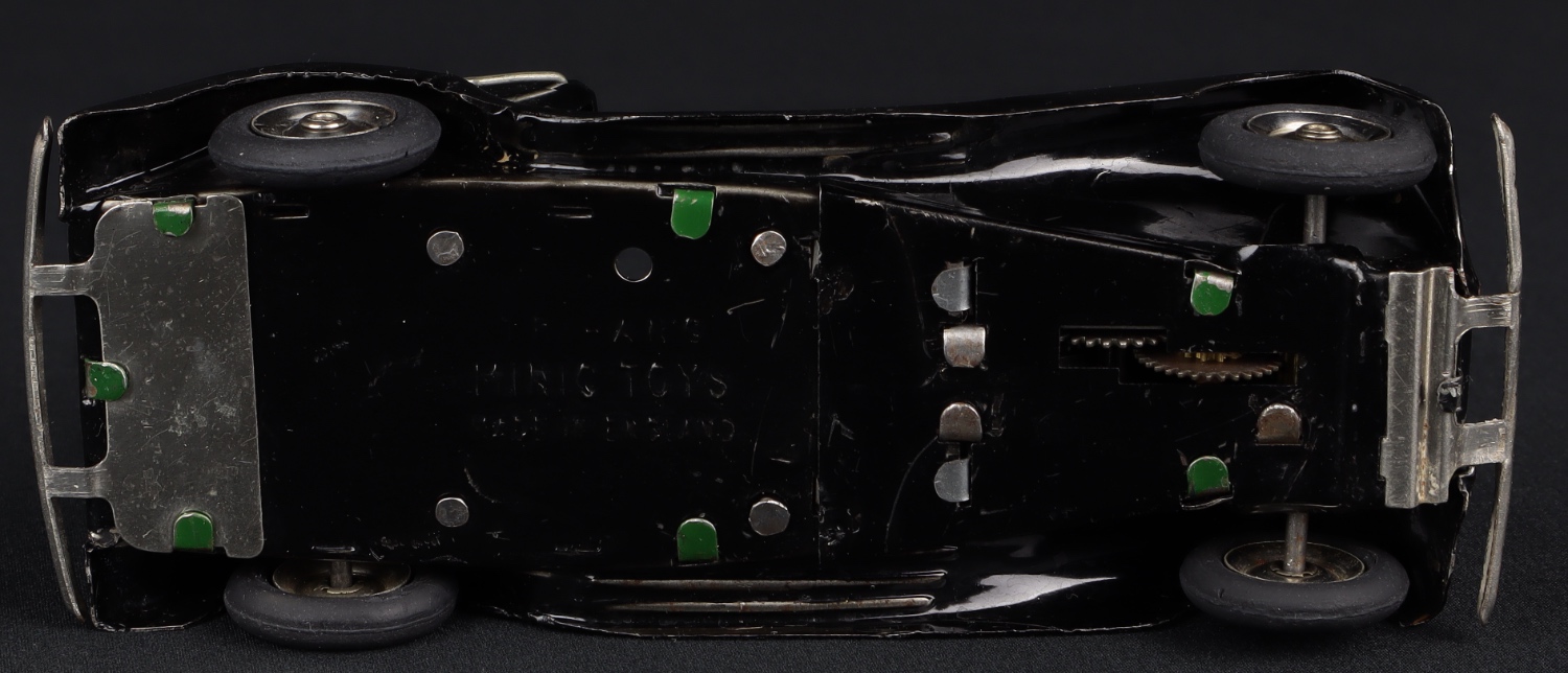 A striking Daimler Sedanca finished in deep green & black. Post-war version with white seating. Shiny dashboard and steering wheel. Bright intact radiator & headlight assembly. Complete windscreen (correct with no glazing). Working motor. Shiny metal wheels, smooth tyres are well-shaped. Working clockwork function.