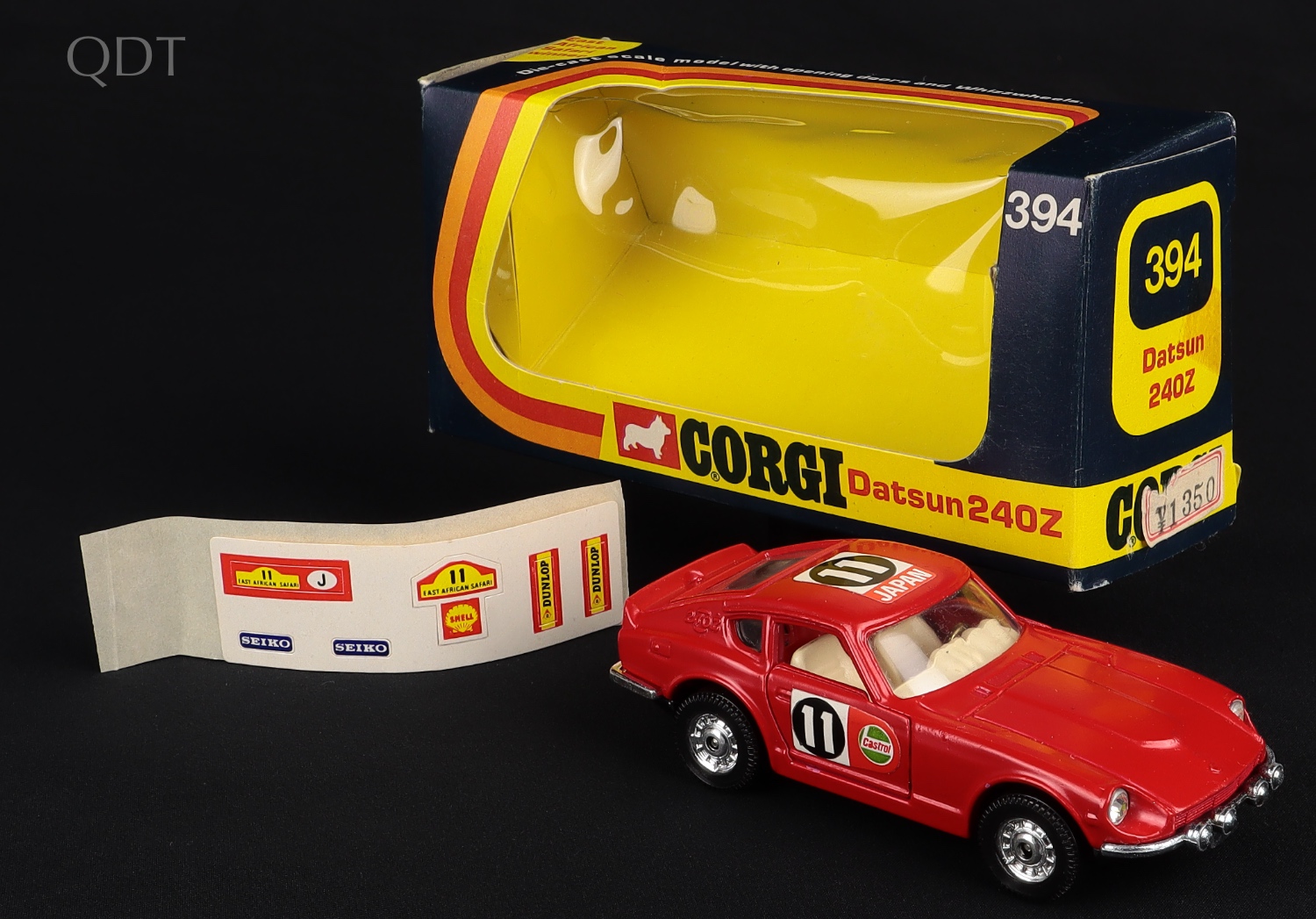 Datsun 240Z 'East African Rally' by Corgi Toys, No. 394. Later version with SPOKED DETAIL wheels. With UNAPPLIED TRANSFER SLIP. Very near mint/boxed. From The Berlin Collection.