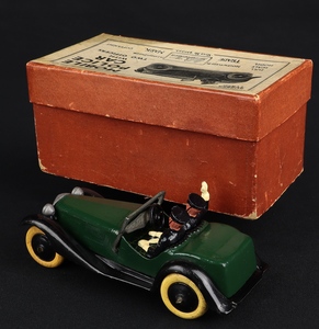 A most unusual find, this is the 1935 issue Mobile Police Car, finished in a deep gloss green and black with shiny black wheels, cast windscreen, radiator and headlight assembly. Smooth tyres are well-shaped and run easily, black seating. Note the tiny repair to the rear bumper (easily overlooked).