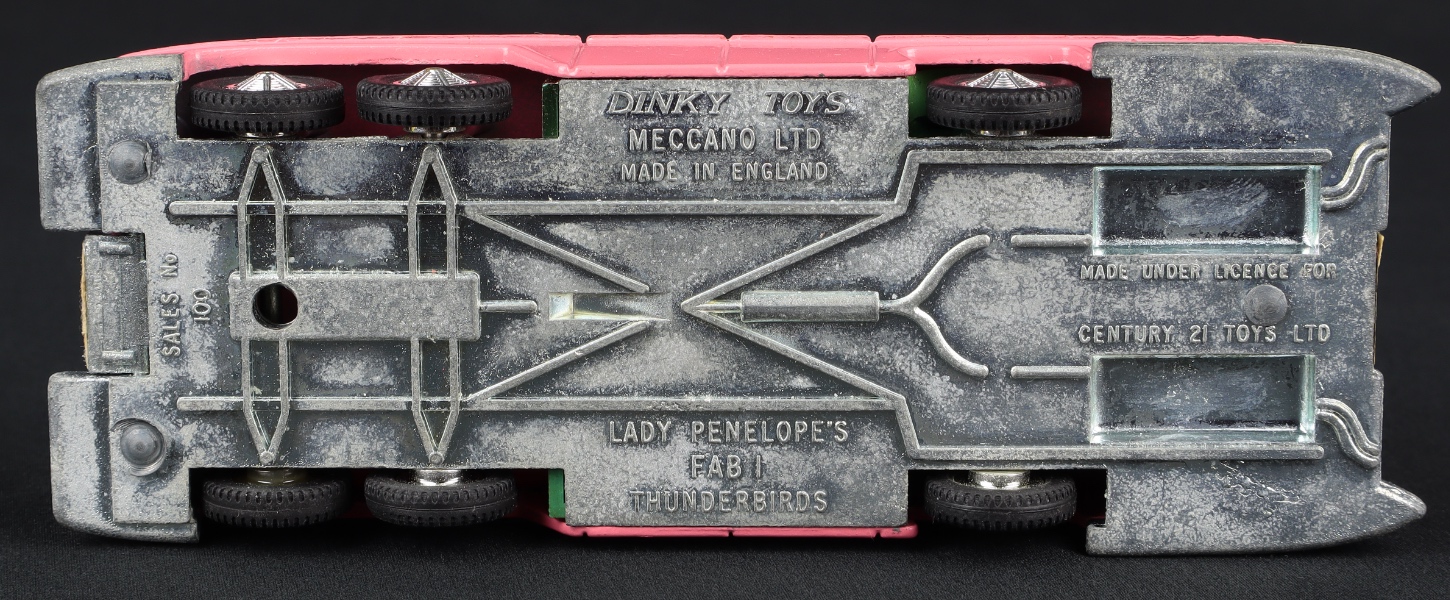 Lady Penelope's Fab 1 by Dinky Toys, No. 100. Very near mint/boxed. Sought-after early issue in rose pink, with pink roof stripes. Mustang-style wheels. With accessories. From The Berlin Collection. Starting bid £200. Please note that QDT apply 12.5% buyer's commission.