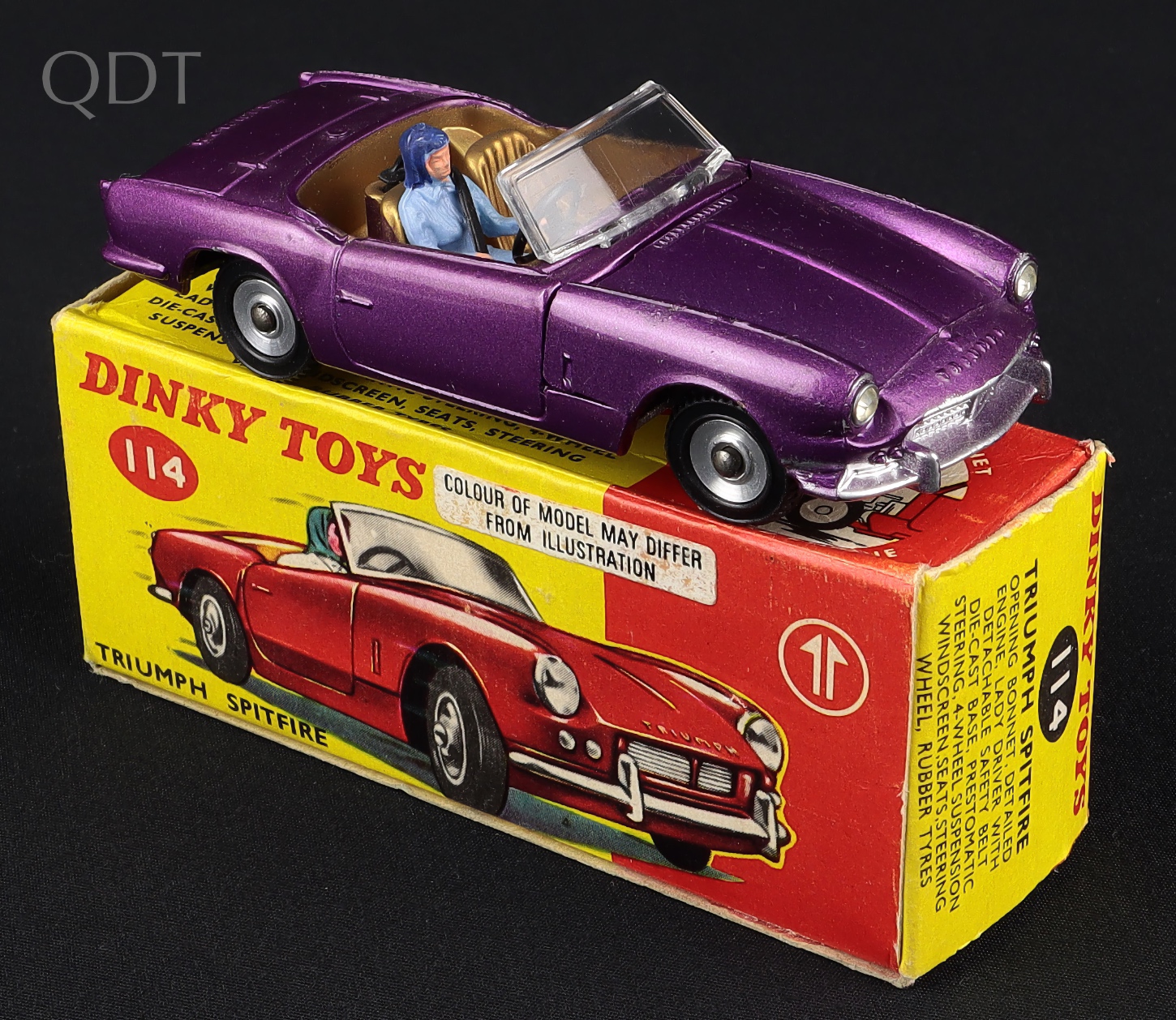 Triumph Spitfire by Dinky Toys, No. 114. Very near mint /boxed. Scarce metallic purple version from a new collection just in.