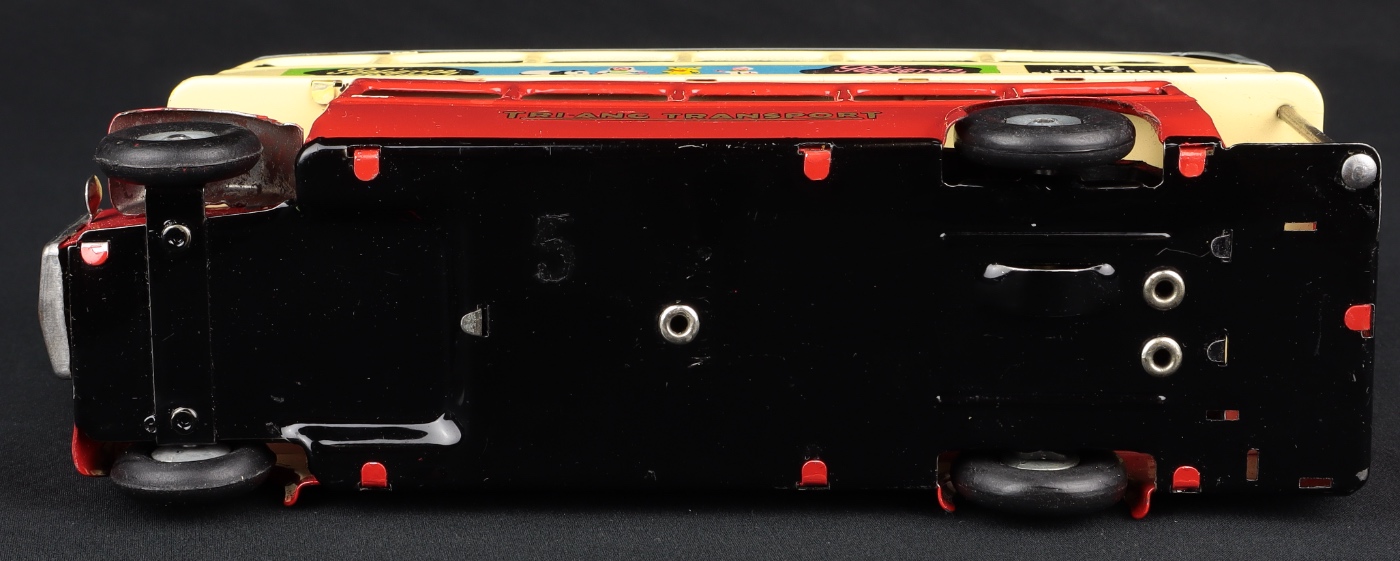 Issued during 1955-56, this Double-Decker Bus has a glossy red finish, with a cream mid-line, and a grey roof. Push & Go function. Most attractive colourful advertisements for ‘PEDIGREE DOLLS’ and ‘TRI-ANG PEDAL MOTORS’ at the sides. Complete colourful transfer at the rear ‘Putney’ destination with registration LBL 174.
