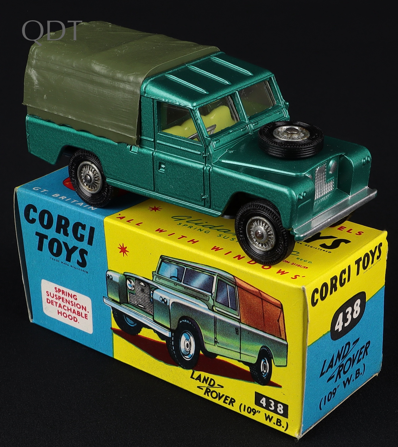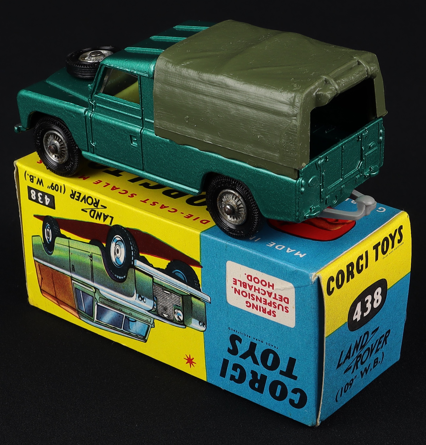 Landrover by Corgi Toys, No. 438. Very, very near mint/boxed. Metallic green with olive green canopy. Cast wheels & late nylon tyres with Corgi Toys embossed. Nice box! Just removed from a factory cellophane overwrap!