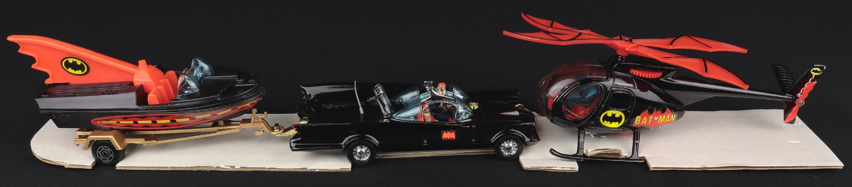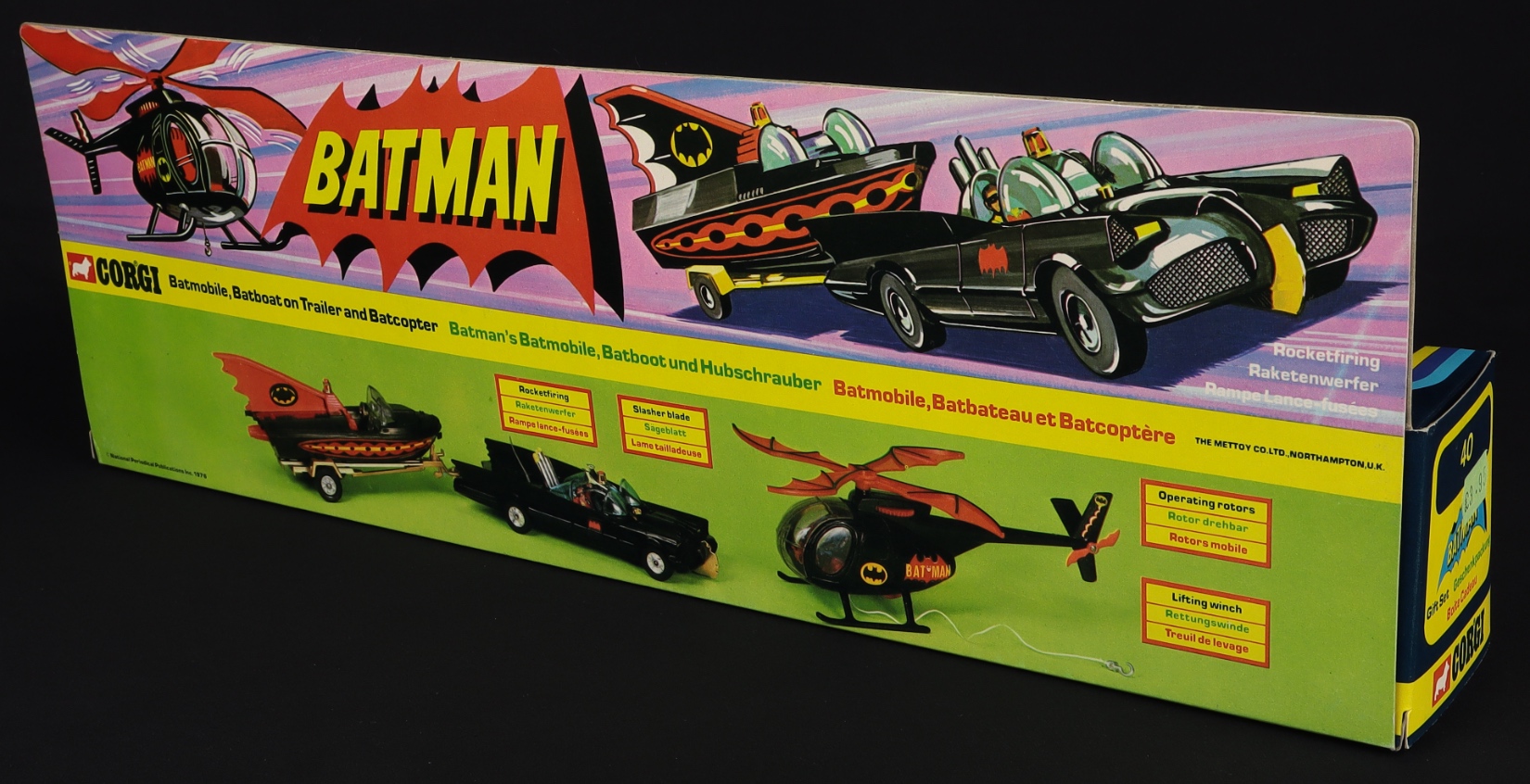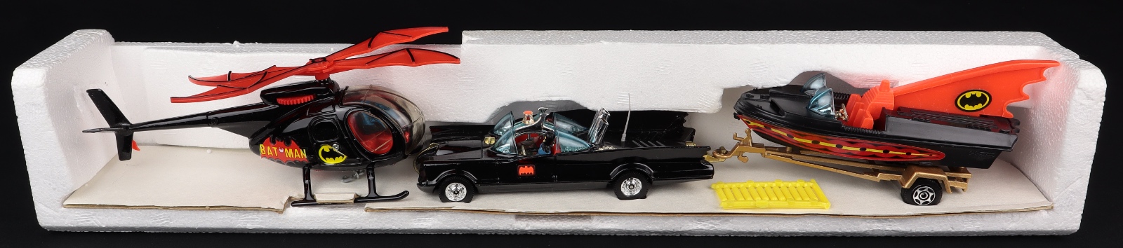 Batman by Corgi Toys, Gift Set No. 40. Three Part Set. Very, very near mint/boxed. Scarce & exceptional set - especially with Rally Whizzwheels. Starting bid £600. Please note that QDT apply 12.5% buyer's commission.