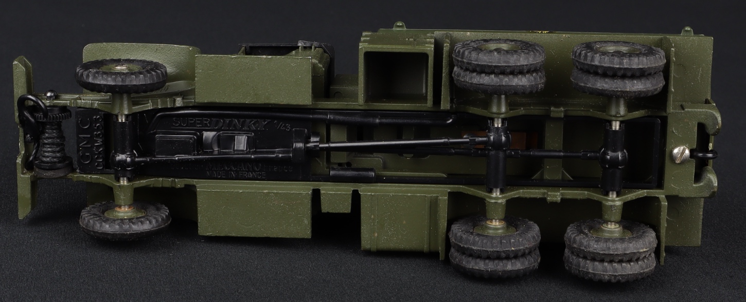 Military G.M.C. Truck by French Dinky Toys, No. 823. Very near mint/boxed. Scarce. With card packing plinth, packing piece, packet of accessories and promotional leaflet. From The Heart of England Collection.