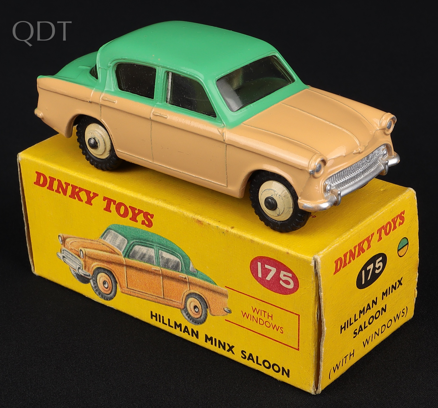 Hillman Minx Saloon by Dinky Toys, No. 175. Very near mint/boxed. Green and tan version WITH green strip running beneath the windscreen. From The Rickman Collection.