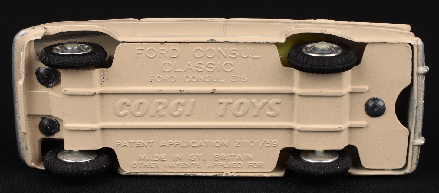 Issued between 1961-65 in various shades, this Consul Classic model has a deeper beige finish with a vivid pink roof, lemon interior. Opening bonnet, spring suspension on all four wheels. Shaped spun hubs. Well-shaped tyres.