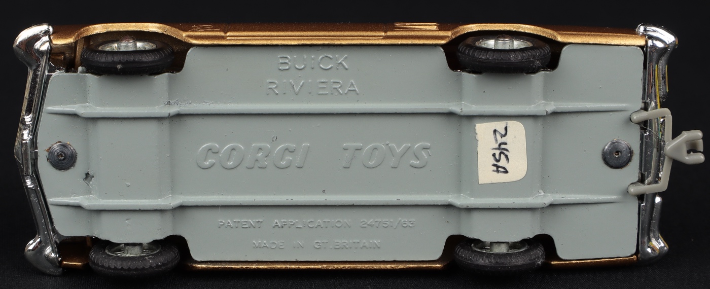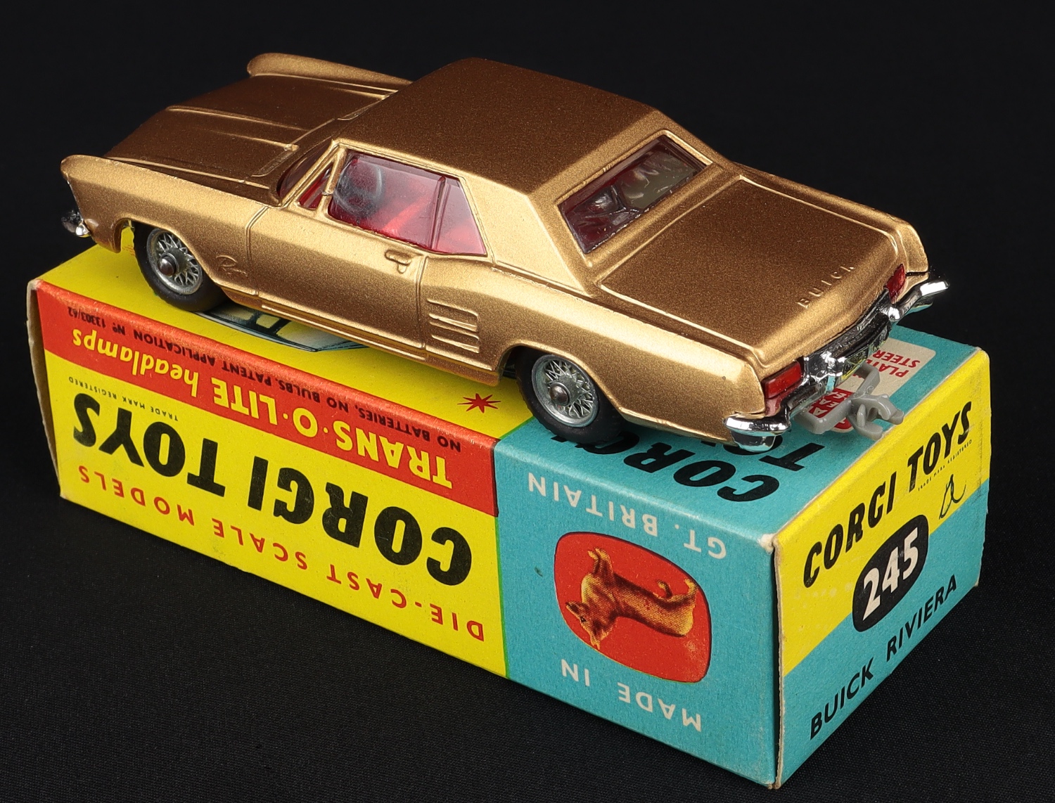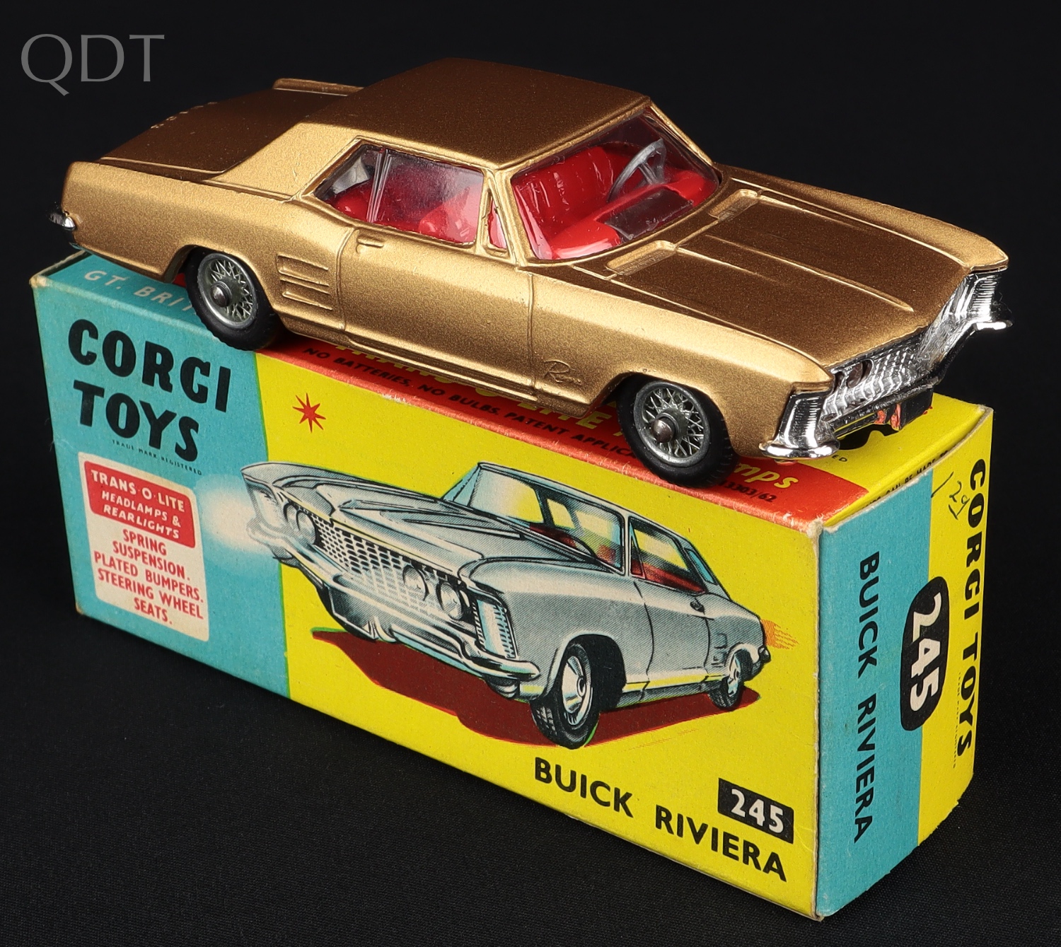 Buick Riviera by Corgi Toys, No. 245. Gold issue, spoked wheels. Very, very near mint/boxed, with model specific leaflet. From The Elmer Collection.