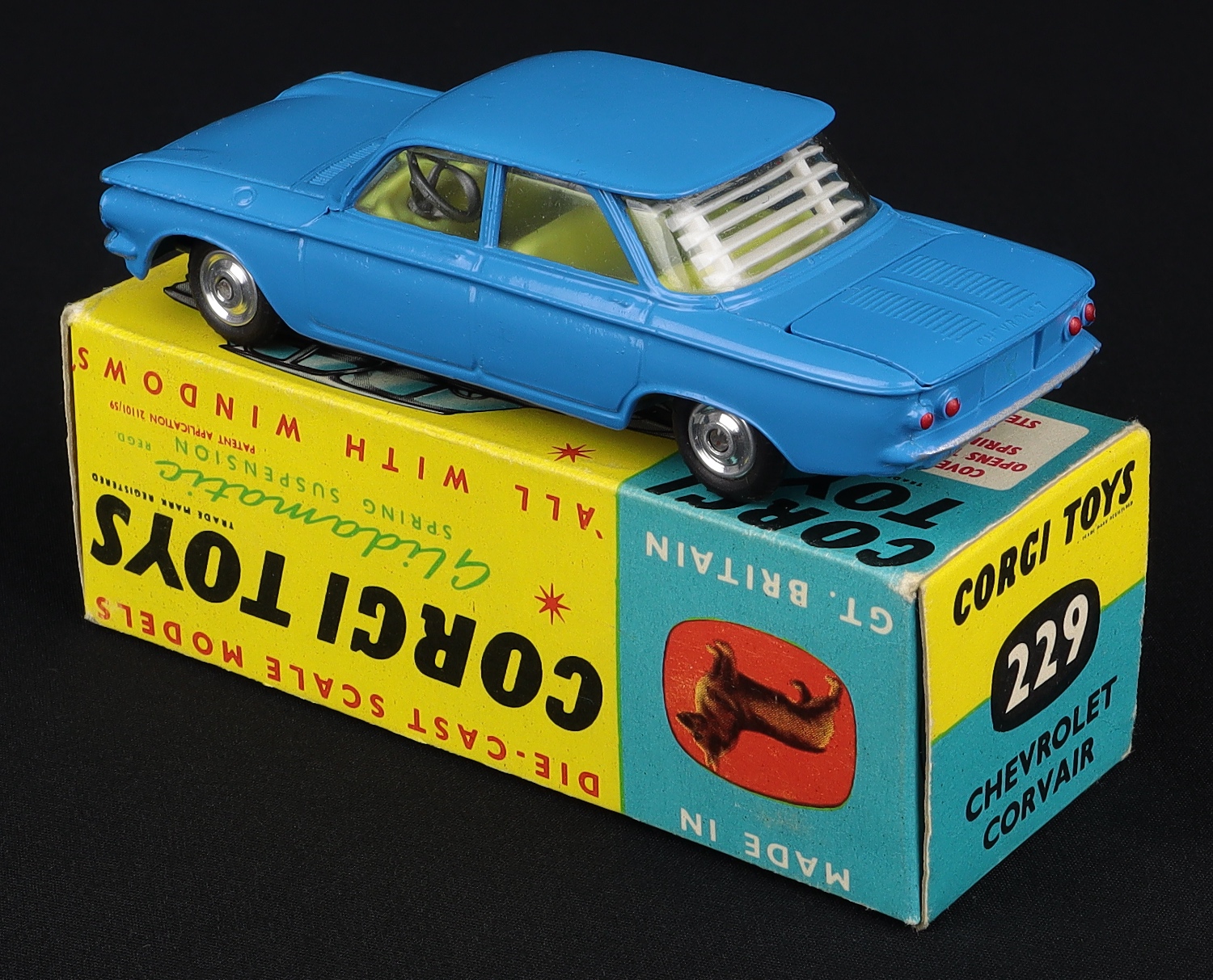 Chevrolet Corvair by Corgi Toys, No. 229. VIBRANT MID-BLUE issue. Very near mint/boxed. From The Elmer Collection.