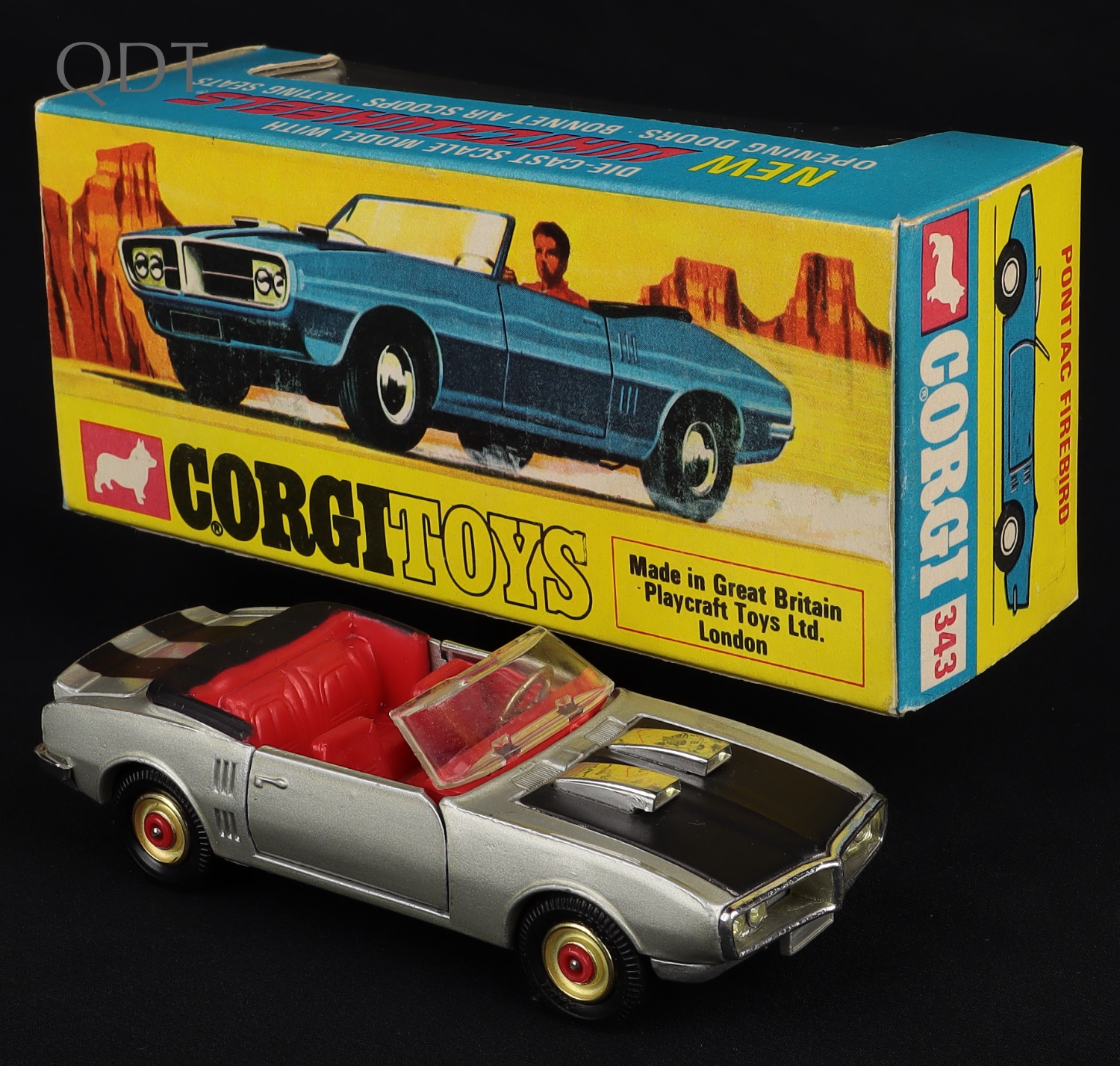 Pontiac Firebird by Corgi Toys, No. 343. Very, very near mint/boxed. *Red Spot wheels version* with ALL-WHITE inner (incomplete). Scarce! From The Gower Collection.
