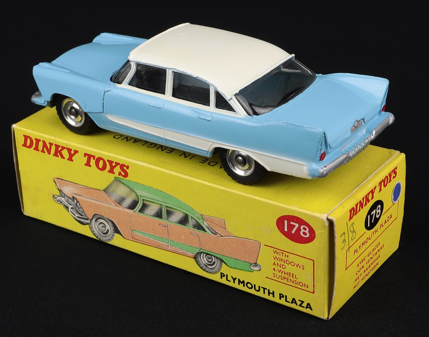 Plymouth Plaza by Dinky Toys, No. 178. Rare issue in sky blue with a white roof and flash. Very near mint/in paler yellow late issue box. From The Rickman Collection.