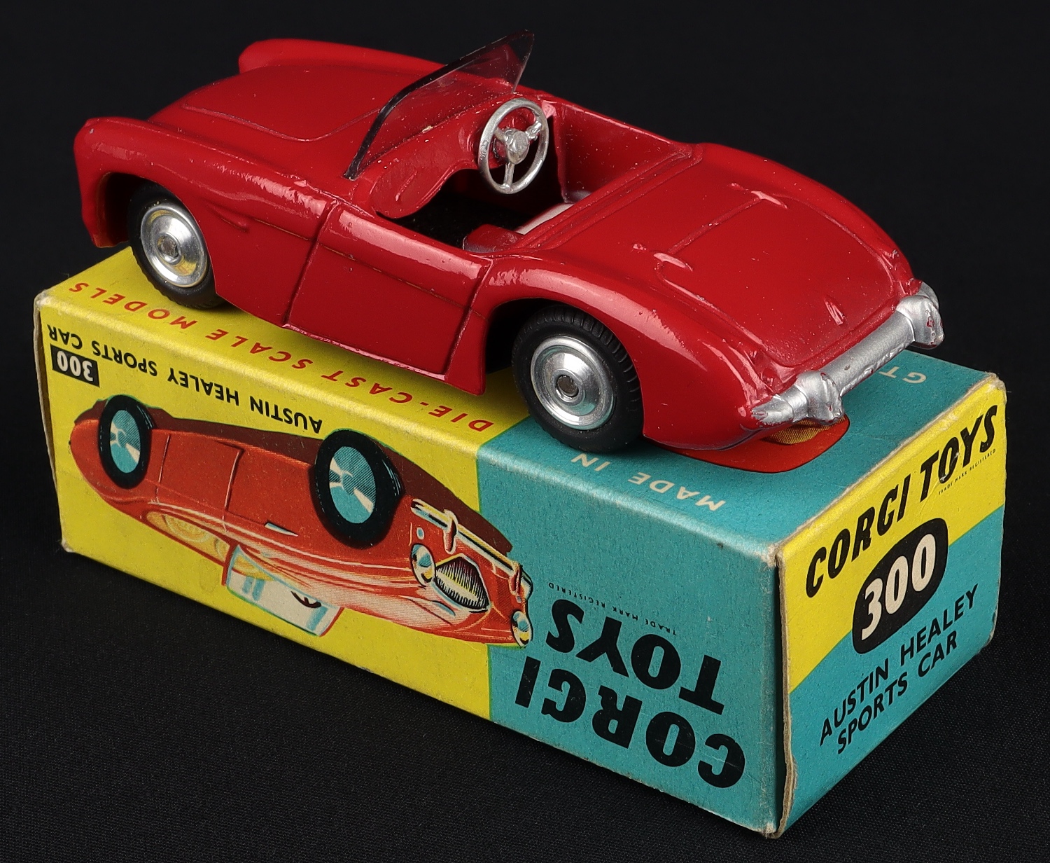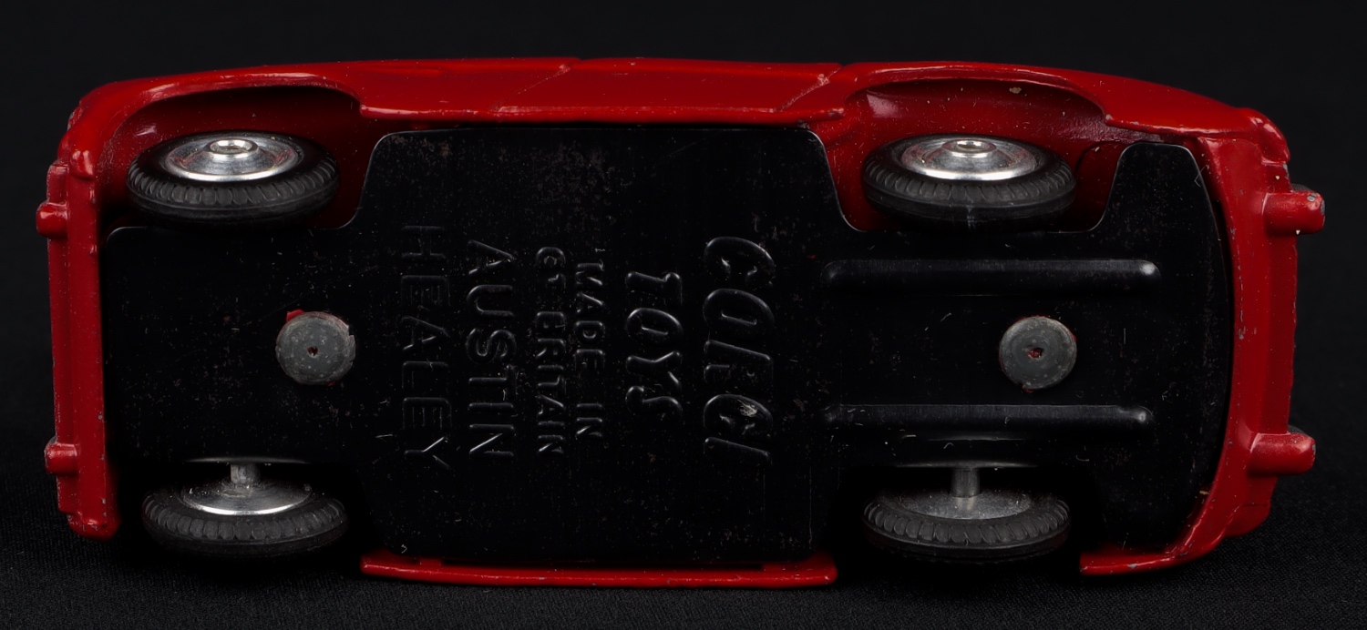 Austin Healey Sports Car by Corgi Toys, No. 300. Very near mint/boxed. Red version with shaped spun wheels. Scarce. From The Elmer Collection.