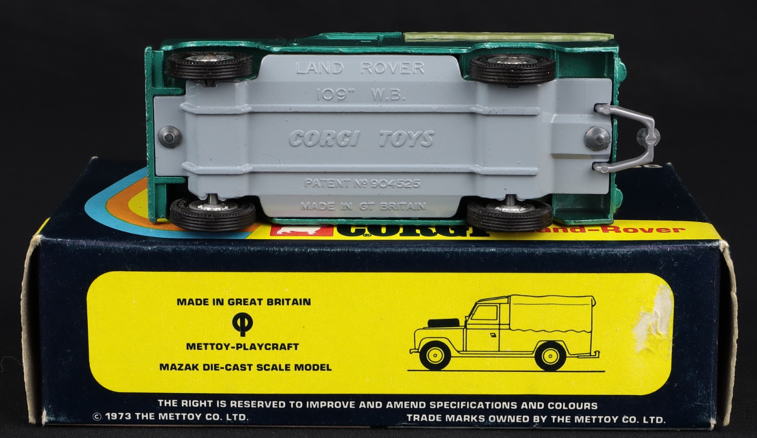 Landrover by Corgi Toys, No. 438. Very, very near mint/boxed. Metallic green with LIGHT OLIVE GREEN canopy. Cast wheels & late nylon tyres with Corgi Toys embossed. Very scarce SLIM RAINBOW window box with shaped yellow card inner with TOP OVERHANG. From 1973 only - and a First for QDT!
