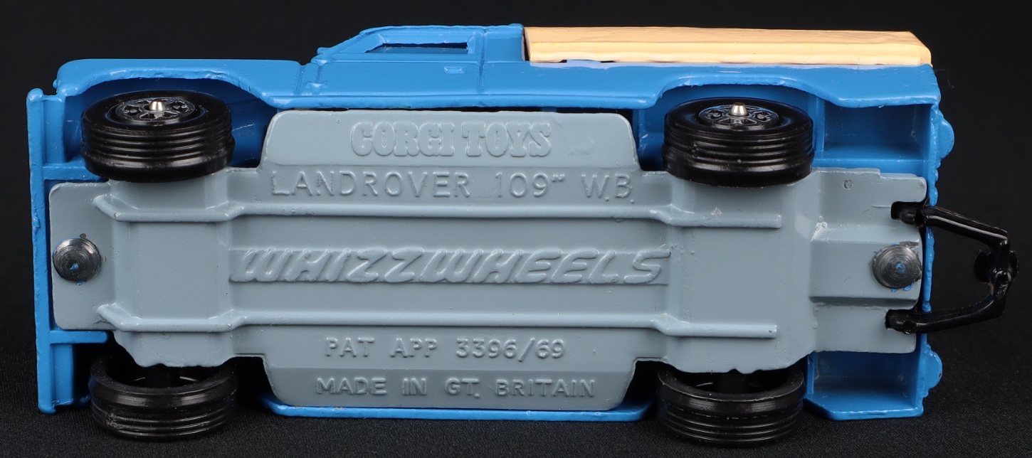 A difficult find. This Landrover is finished in deep sky blue, with a cream interior, black steering wheel and whizzwheels with suspension. Deep cream moulded canopy. Rivetted. Black plastic tow hook.