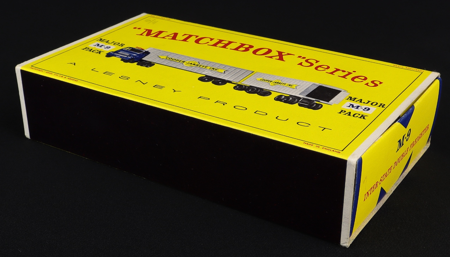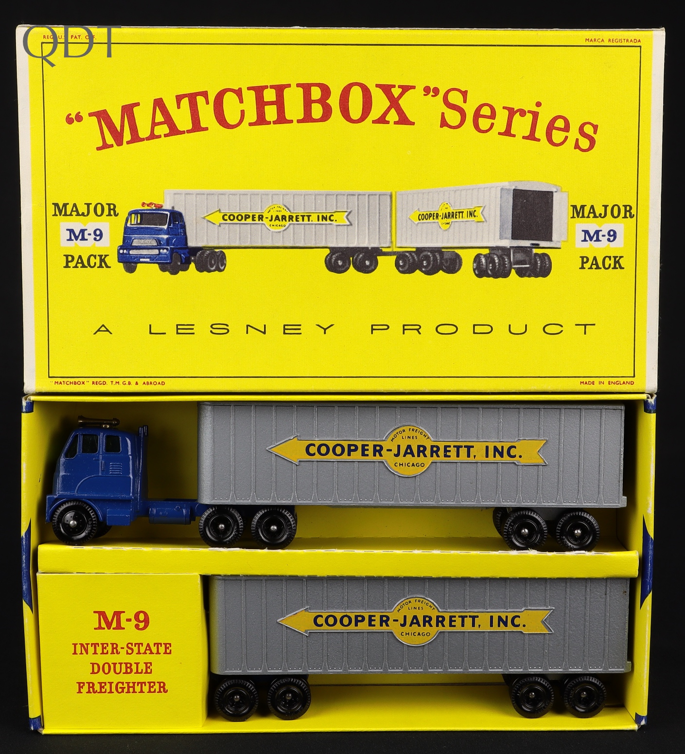 Inter-State Double Freighter 'Cooper-Jarrett' by Matchbox Models, M-9. Very near mint/ in SUPER-FRESH early box. First issue with dark blue lettering on yellow background. From Boris's Collection. Starting bid £175. Please note that QDT apply 12.5% buyer's commission.