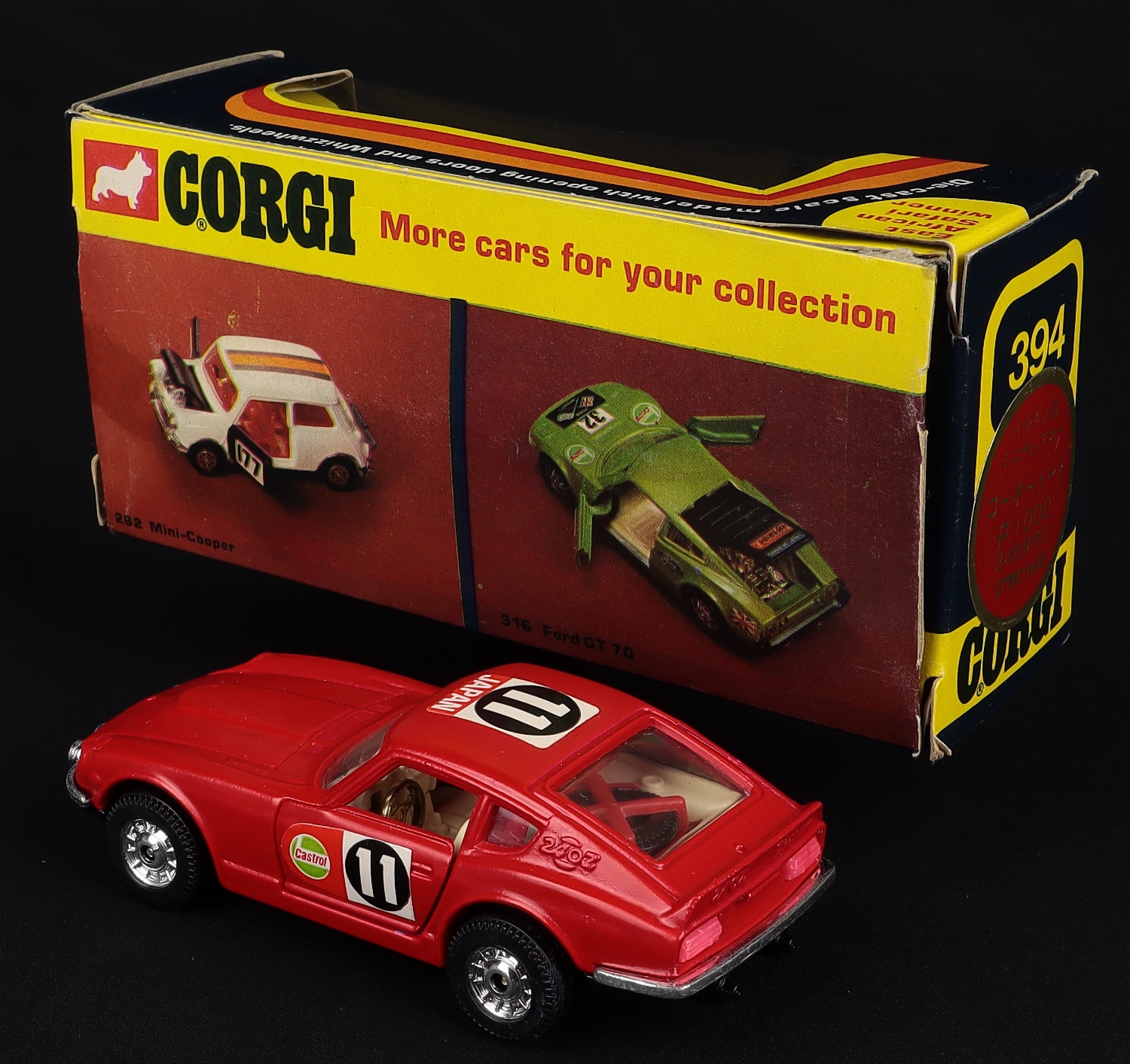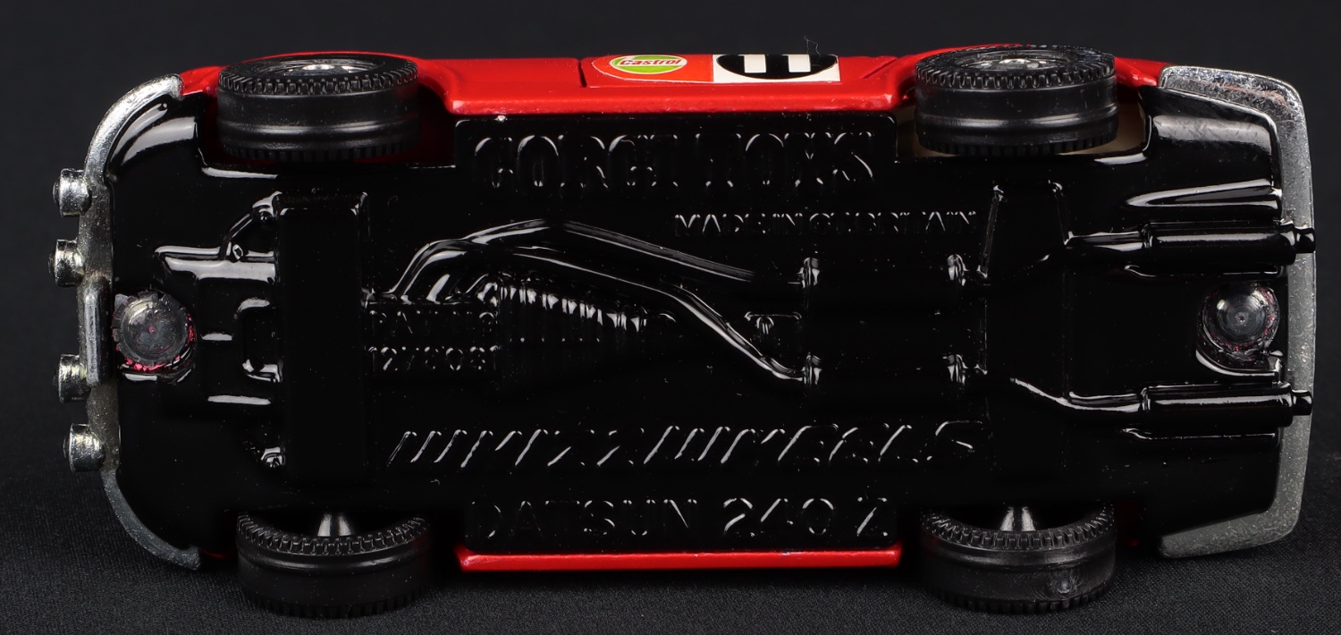 In bright red East African Rally finish with perfect labels – ‘CASTROL’, ‘JAPAN’ and racing number 11. Jewelled headlights, pale cream interior, and opening doors.