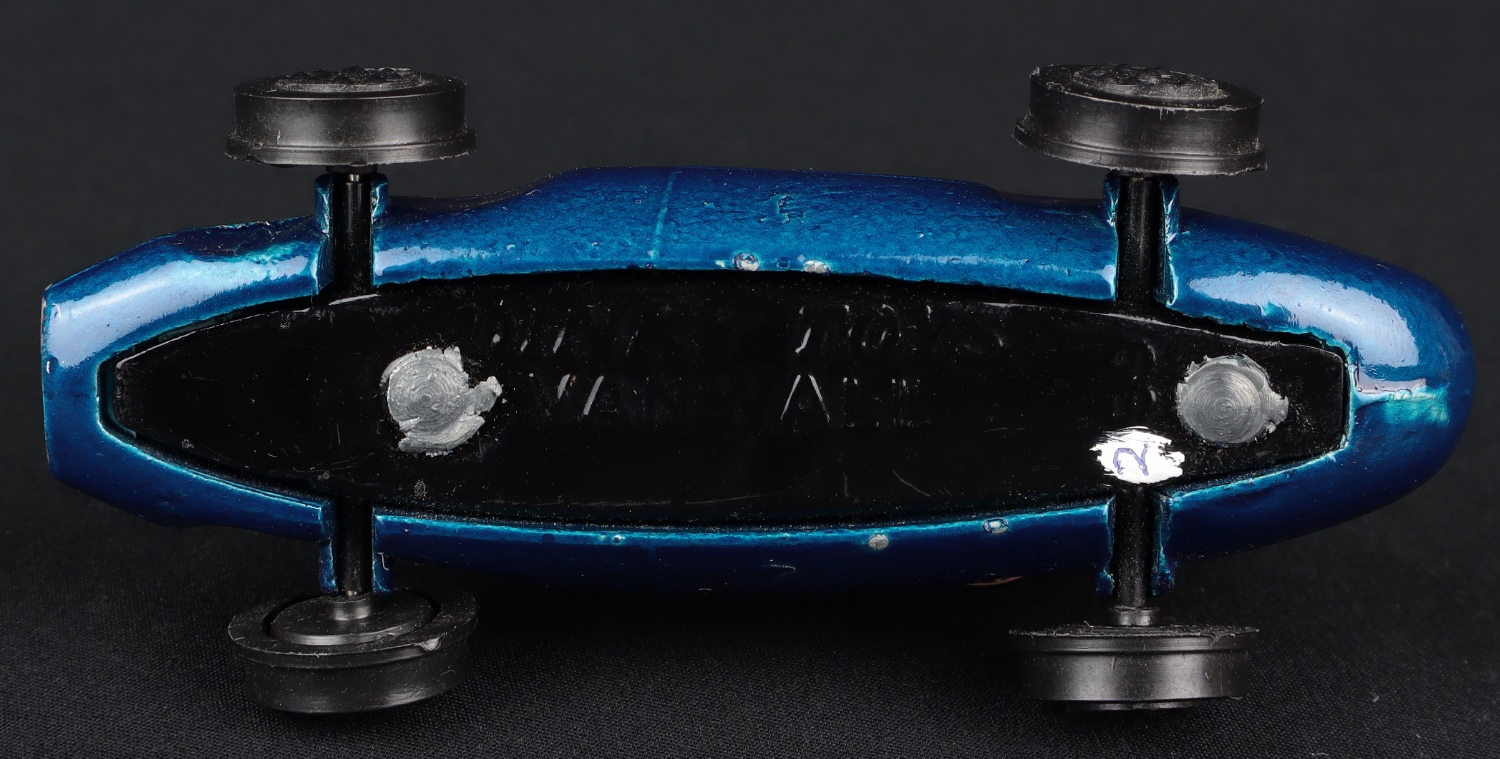 A virtually mint example finished in vivid metallic blue, blue plastic driver, black steering wheel. Black plastic one-piece tyres/wheels.