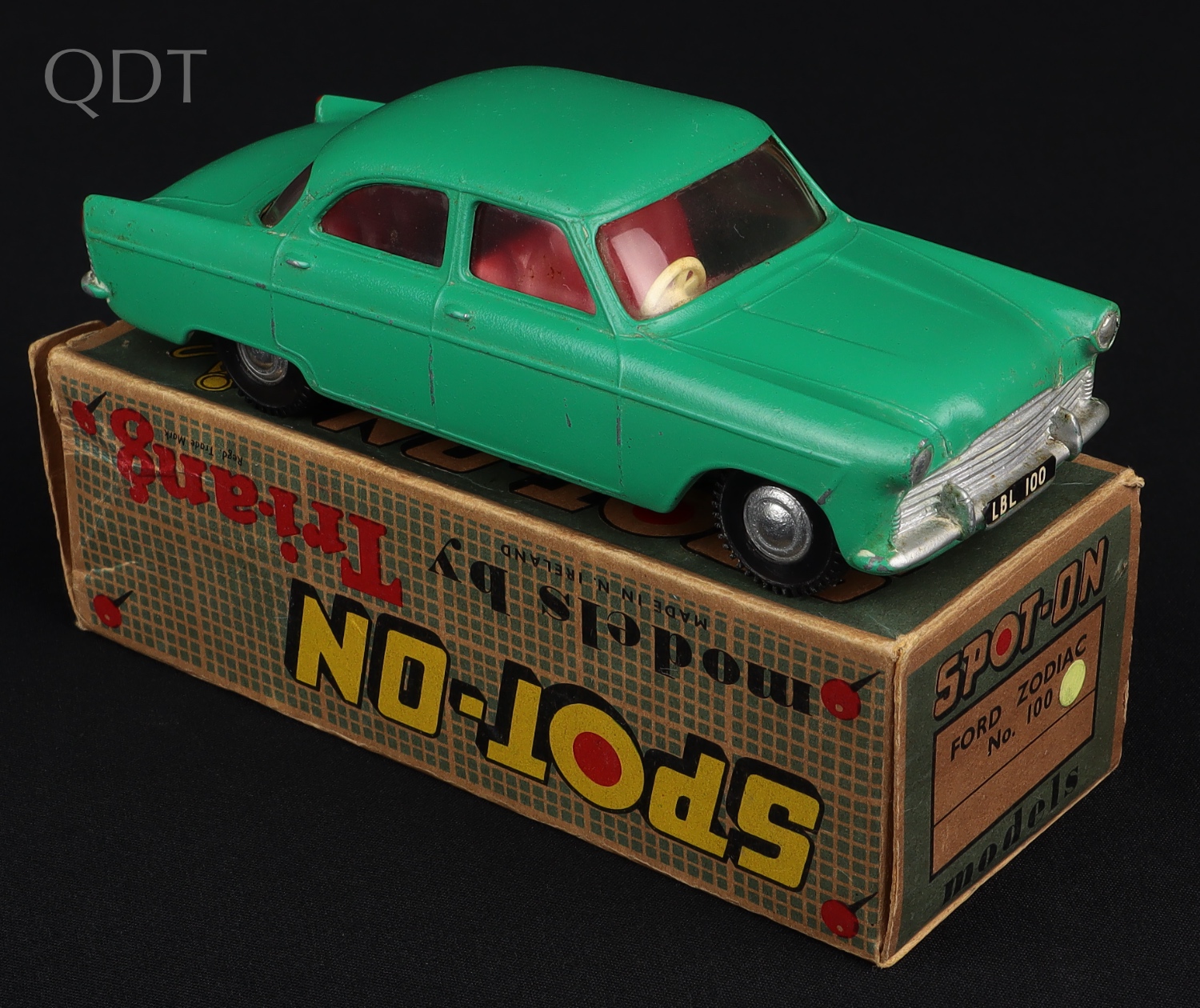 Ford Zodiac by Spot-on Models, No. 100. JADE GREEN with a red interior. Very scarce - and A First for QDT! Near mint plus/boxed. From The 25 Year Collection in California. QDT starting bid £150. Please note that QDT apply 12.5% buyer's commission.