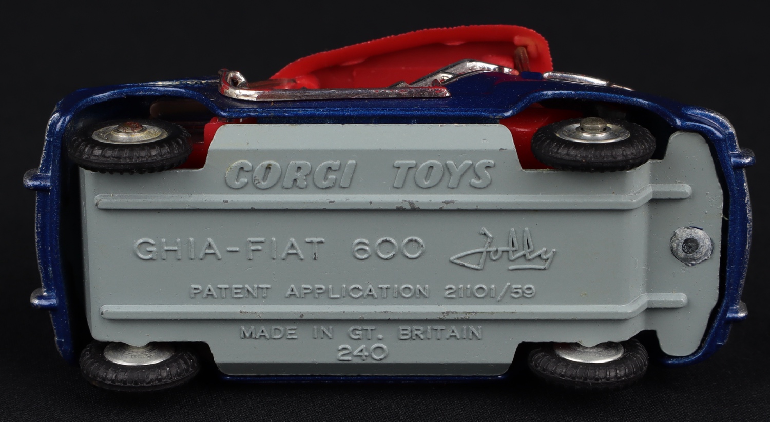 Ghia-Fiat Jolly by Corgi Toys, No. 240. Very near mint/boxed, with card packing ring. Scarce version in dark metallic blue. From The Elmer Collection.