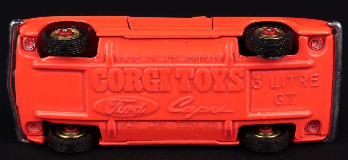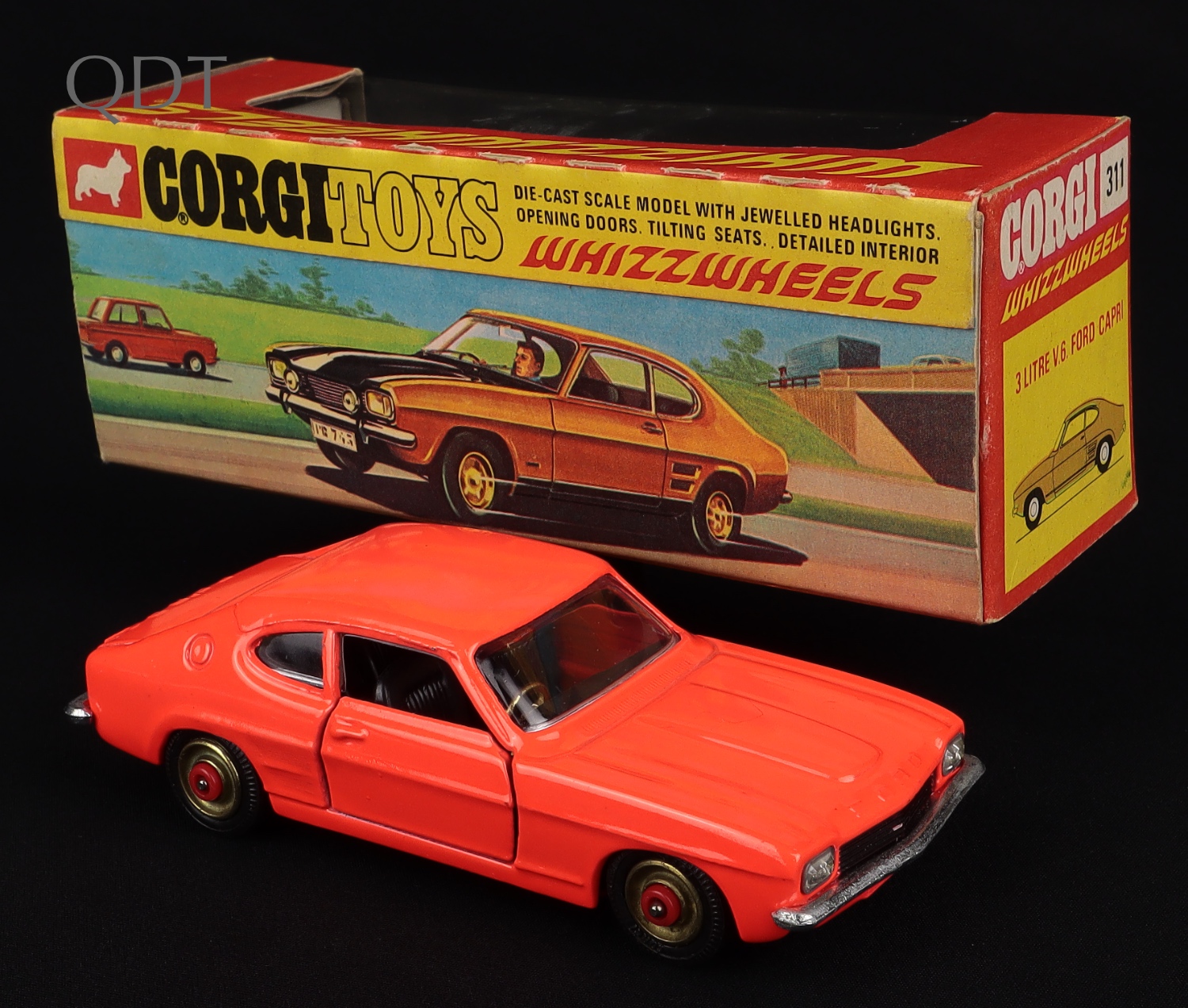 3 Litre V6 Ford Capri by Corgi Toys, No. 311. Very near mint/boxed. Fluorescent orange with red spot wheels. Box version WITH '311' printed on box front. From The Elmer Collection. QDT starting bid £250. Please note that QDT apply 12.5% buyer's commission.