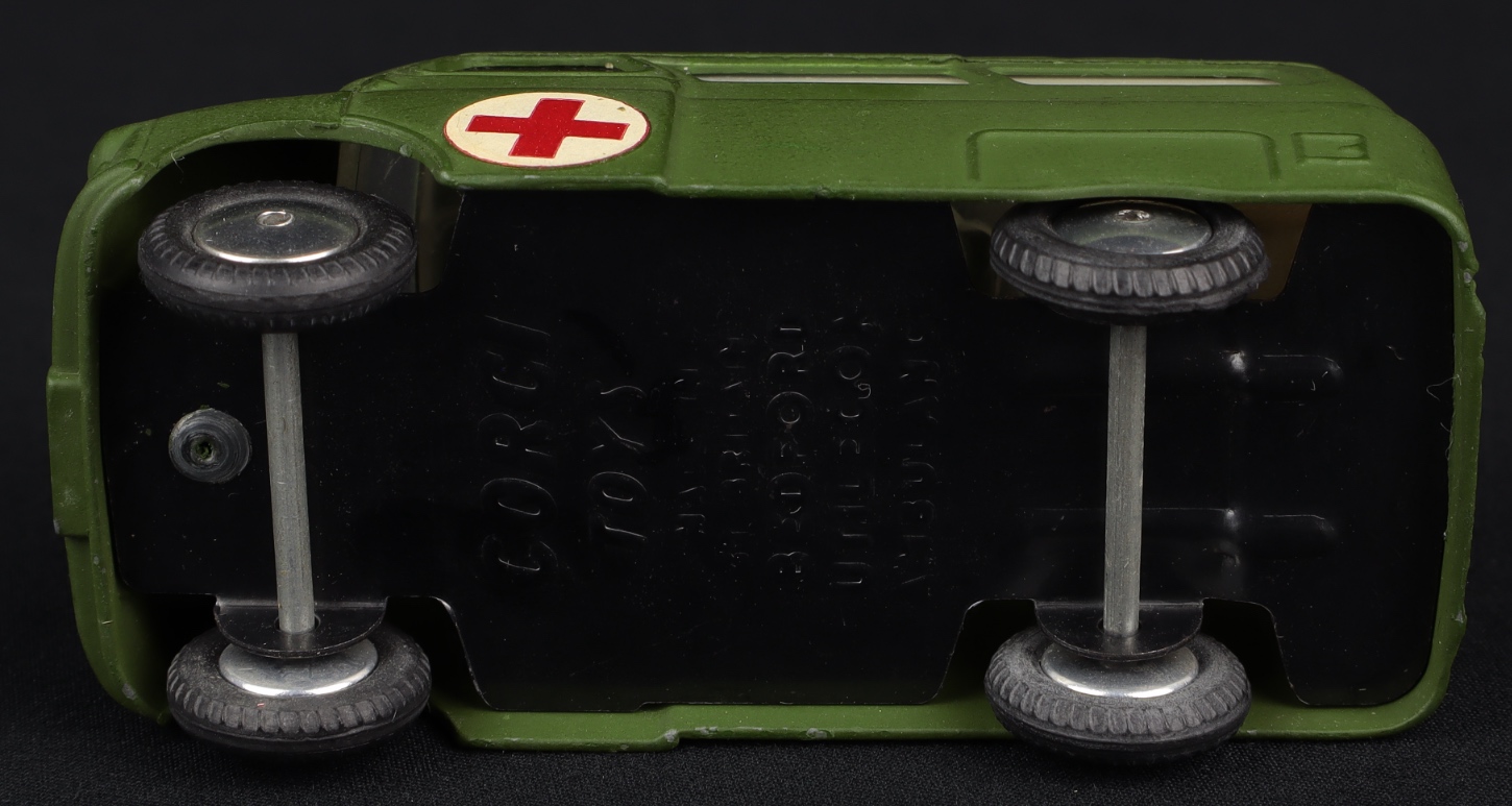 Issued between 1961-63, this fine Bedford Military Ambulance model has a matte olive green finish, bright red cross labels on both doors and one on the roof, flat spun wheels (so first issue) and a bright baseplate.