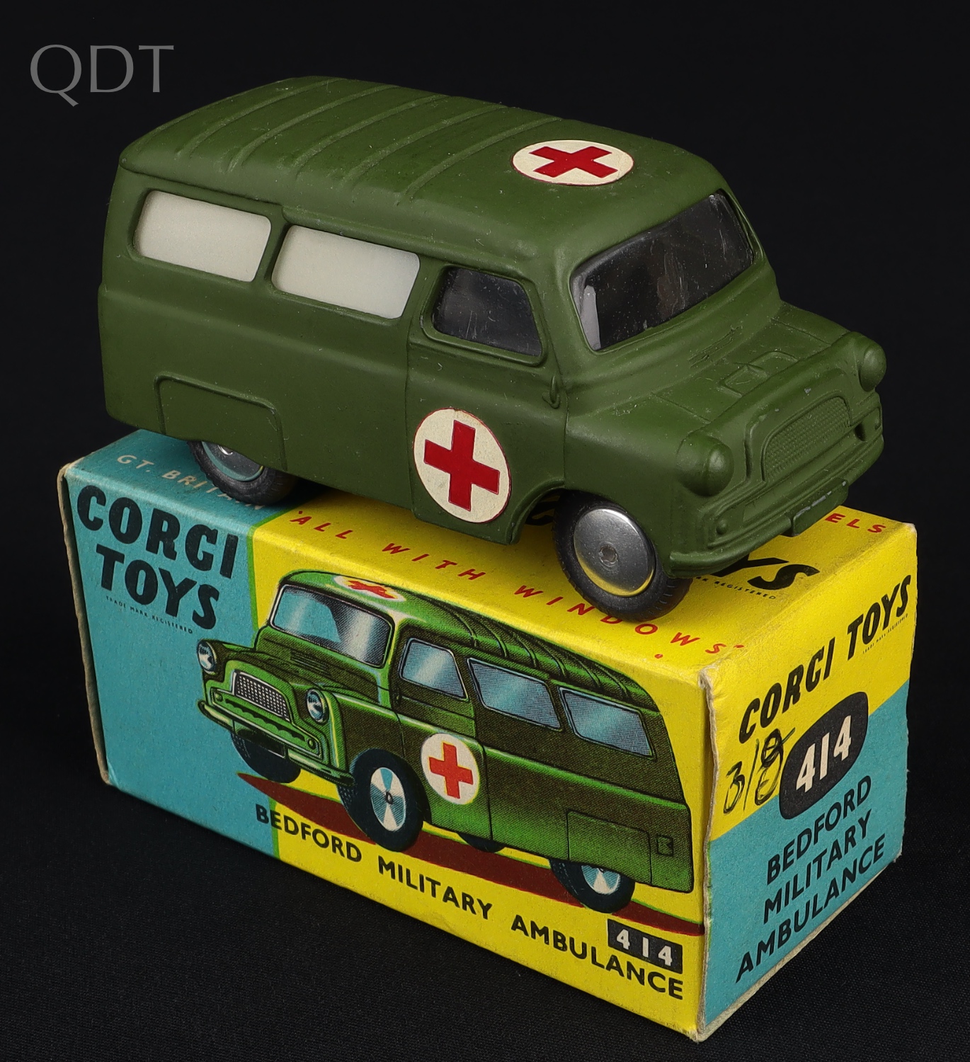 Bedford Military Ambulance by Corgi Toys, No. 414. Very near mint/boxed. First issue with FLAT spun wheels. From The Elmer Collection.