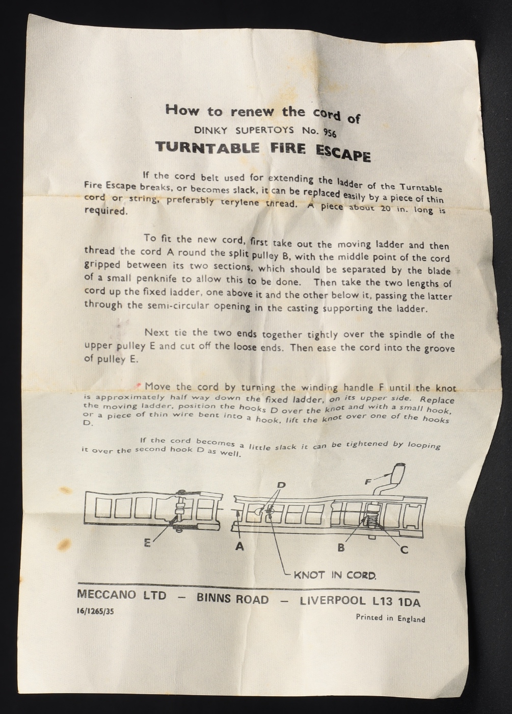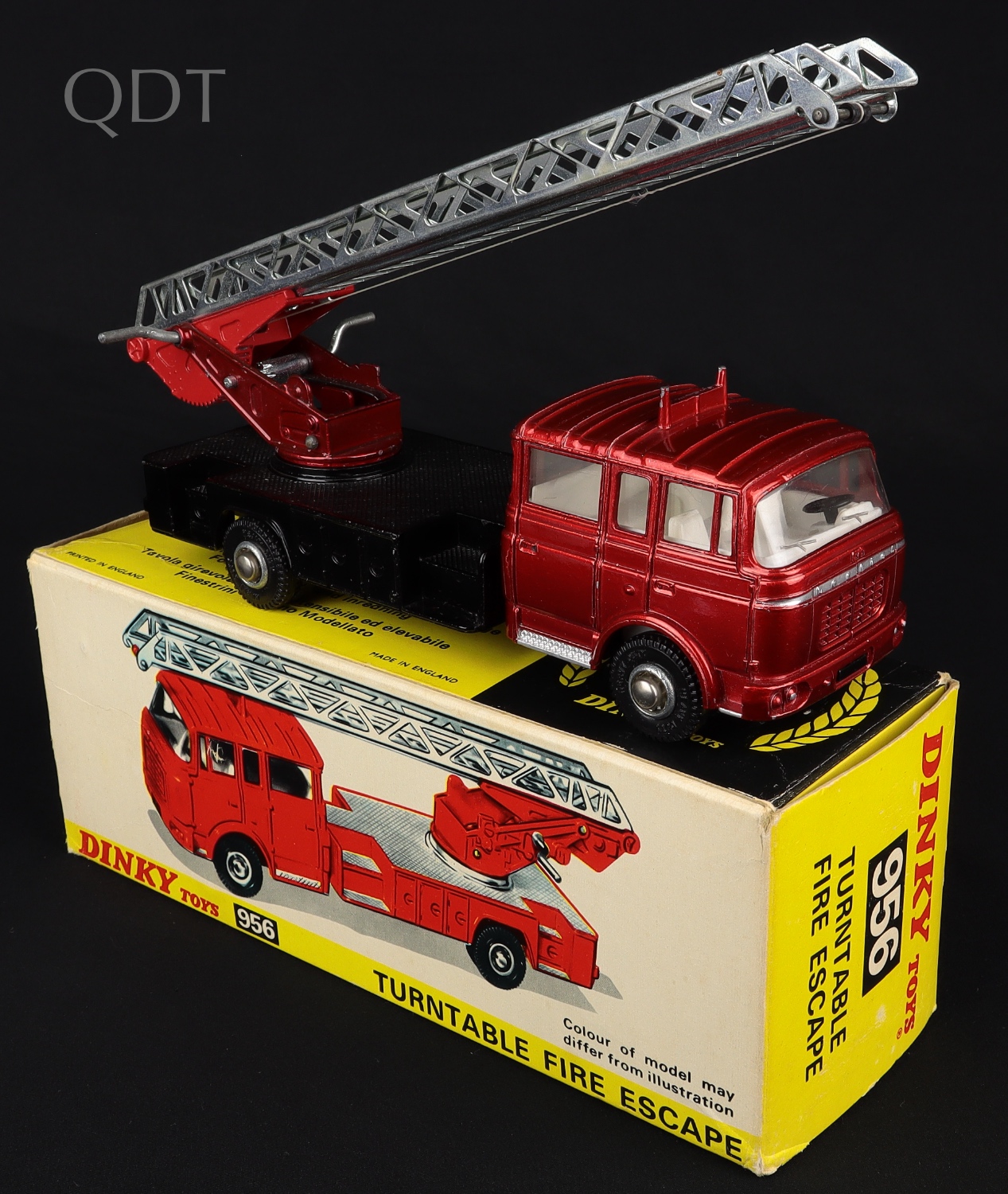Berliet Turntable Fire Escape Lorry by Dinky Toys, No. 956. Scarce Berliet cab issue with a black platform. Metallic red & black with factory painted non-metallic red jib support. Near mint plus/boxed. With Instruction Leaflet. From The 25 Year Collection in California.