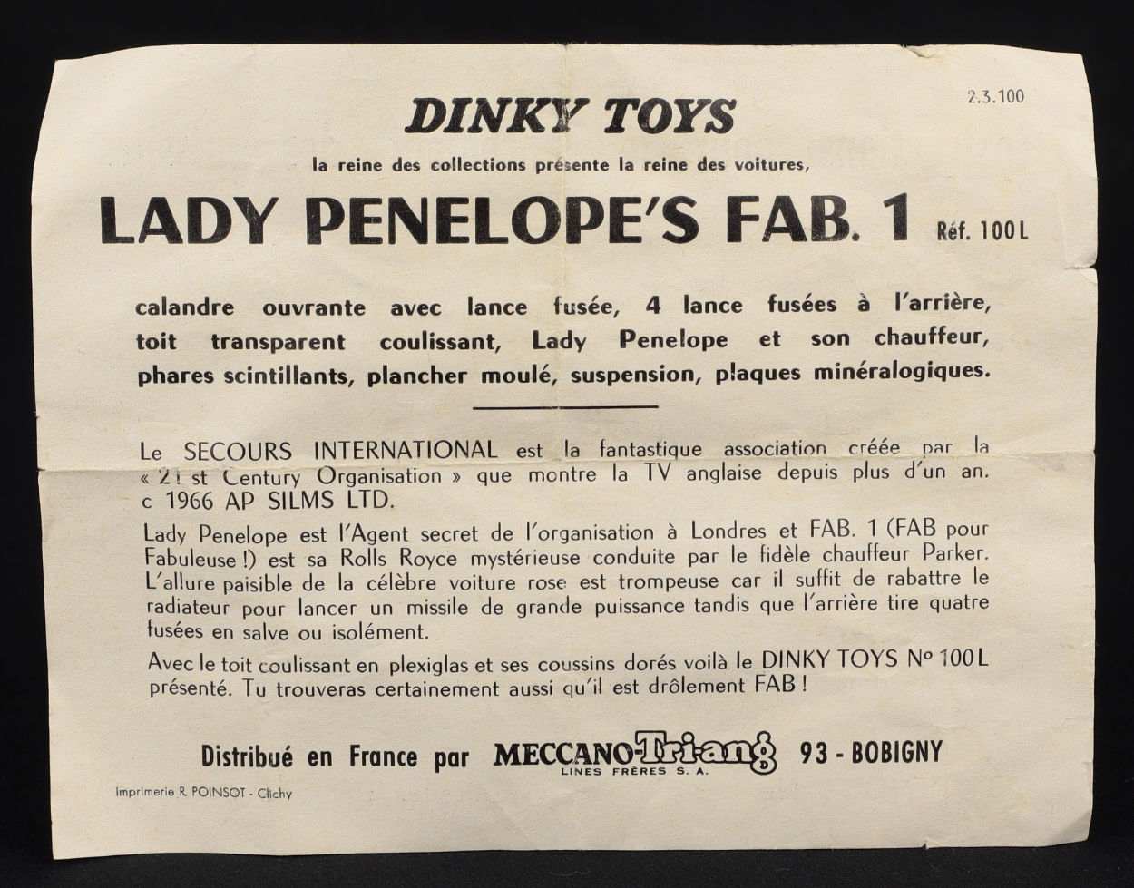 Lady Penelope's Fab 1 by Dinky Toys, No. 100. Very near mint (but lacks rear number-plate)/boxed. Sought-after early issue in rose pink, with pink roof stripes. With all accessories. Working functions. With French Promotional Leaflet included. From The Heart of England Collection. Starting bid £250. Please note that QDT apply 12.5% buyer's commission.