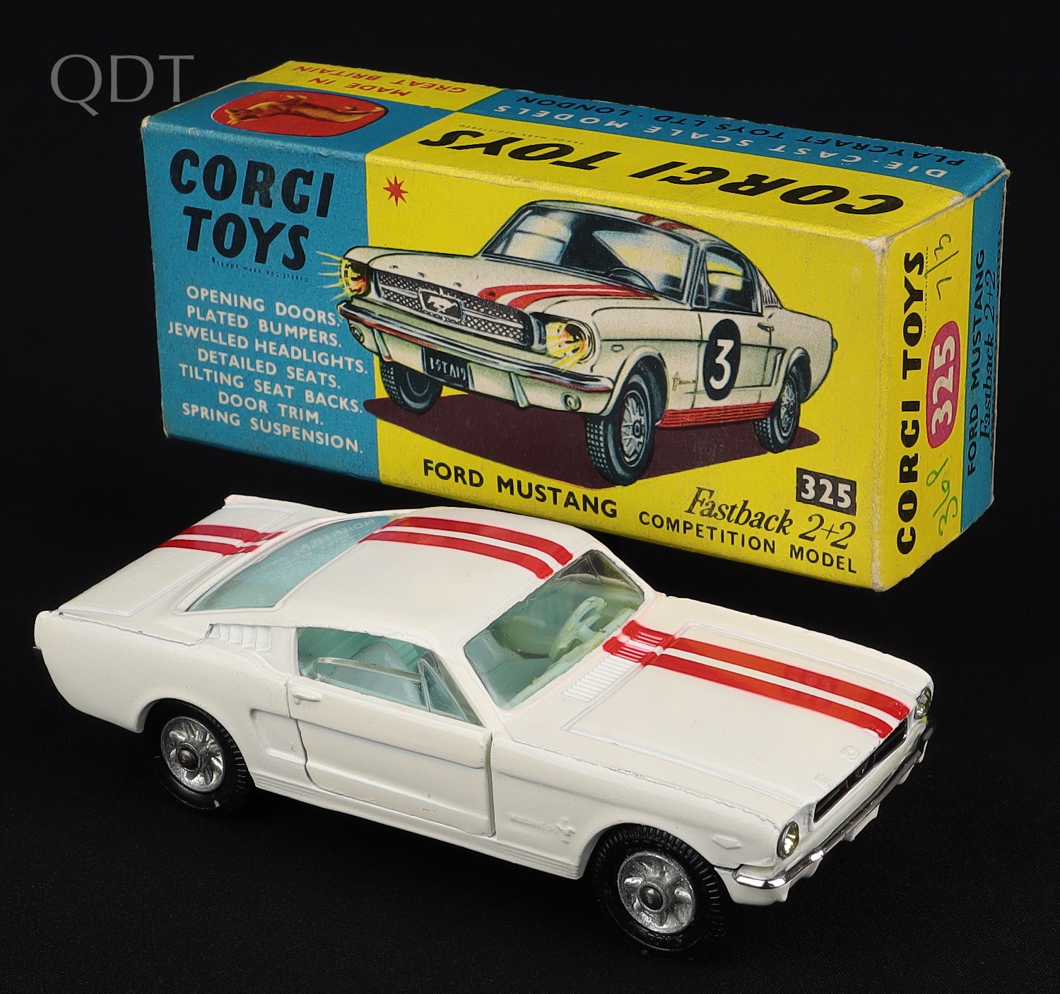 Ford Mustang Fastback 2 + 2 Competition Model by Corgi Toys, No. 325. With red stripes. DETAILED CAST WHEELS issue. BLUE INTERIOR & version WITHOUT formed shape for Corgi dog at rear. Very near mint/boxed. From The Elmer Collection.