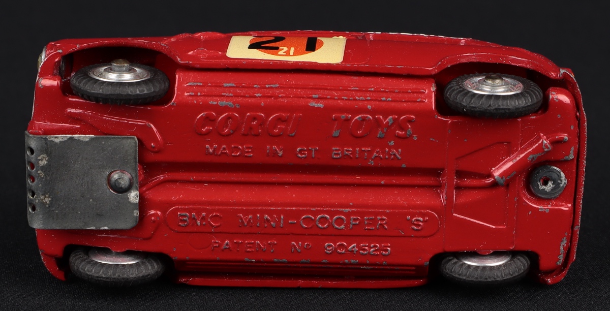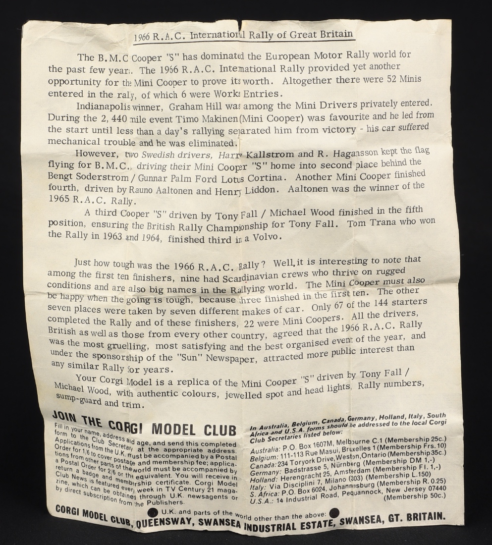 1966 Mini Cooper 'S' "SUN-RAC Rally" by Corgi Toys, No. 333. Shaped spun wheel issue. Near mint/boxed (wear). With Leaflet. From The Elmer Collection.