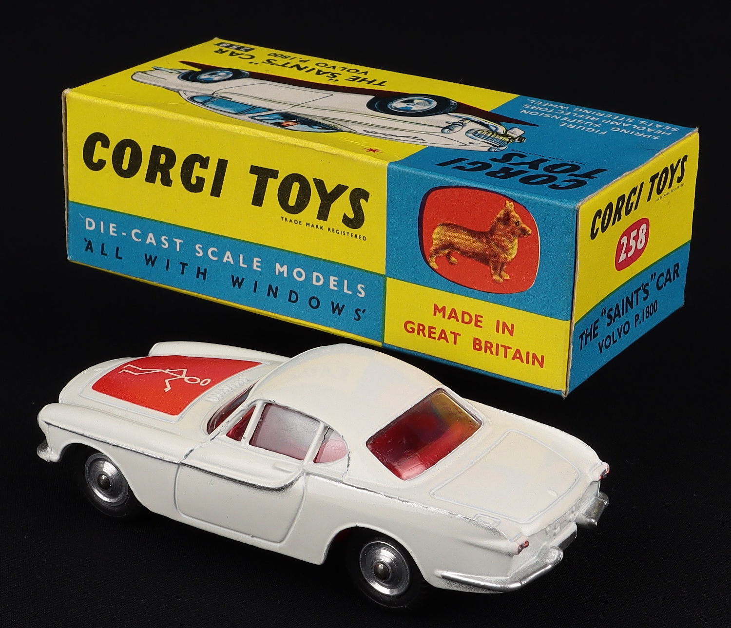 The "Saint's" Car Volvo P.1800 by Corgi Toys, No. 258. With matchstick figure on orange-red label, shaped spun wheels. Scarce issue. Very near mint/boxed. From The Elmer Collection.