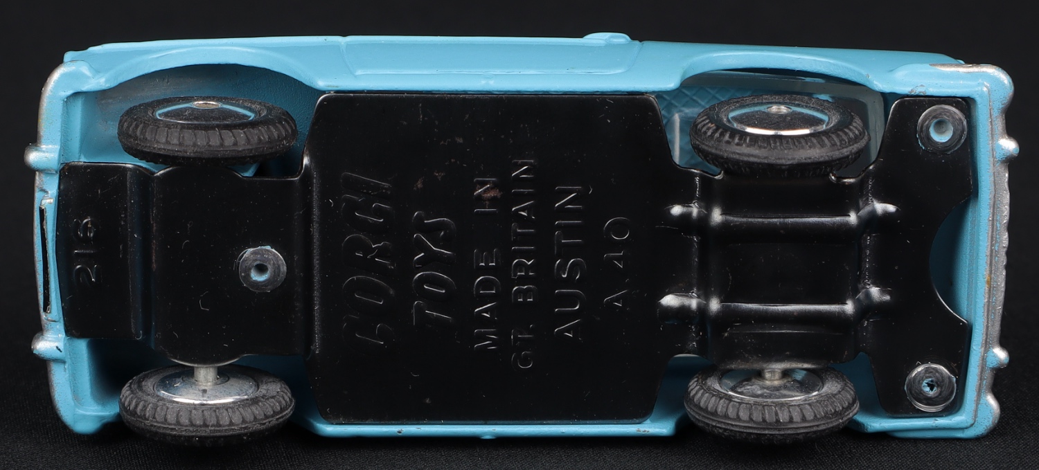 Austin A40 by Corgi Toys, No. 216. Two-tone blue issue with flat spun wheels. Very near mint/boxed. From The Elmer Collection.