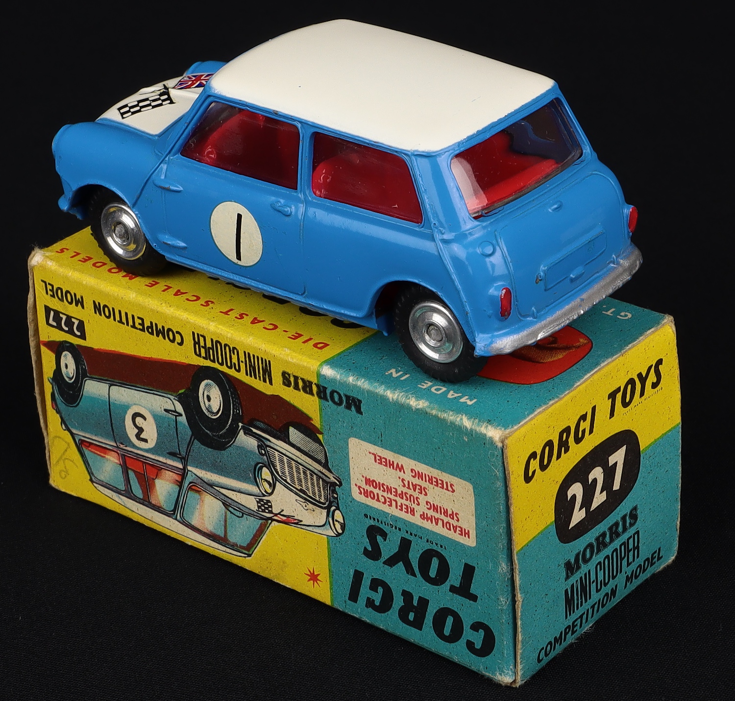 Morris Mini-Cooper Competition Model by Corgi Toys, No. 227. Very near mint/boxed. Blue with white roof and bonnet issue. Narrow racing number 1. From The Elmer Collection. Starting bid £200. Please note that QDT apply 12.5% buyer's commission.