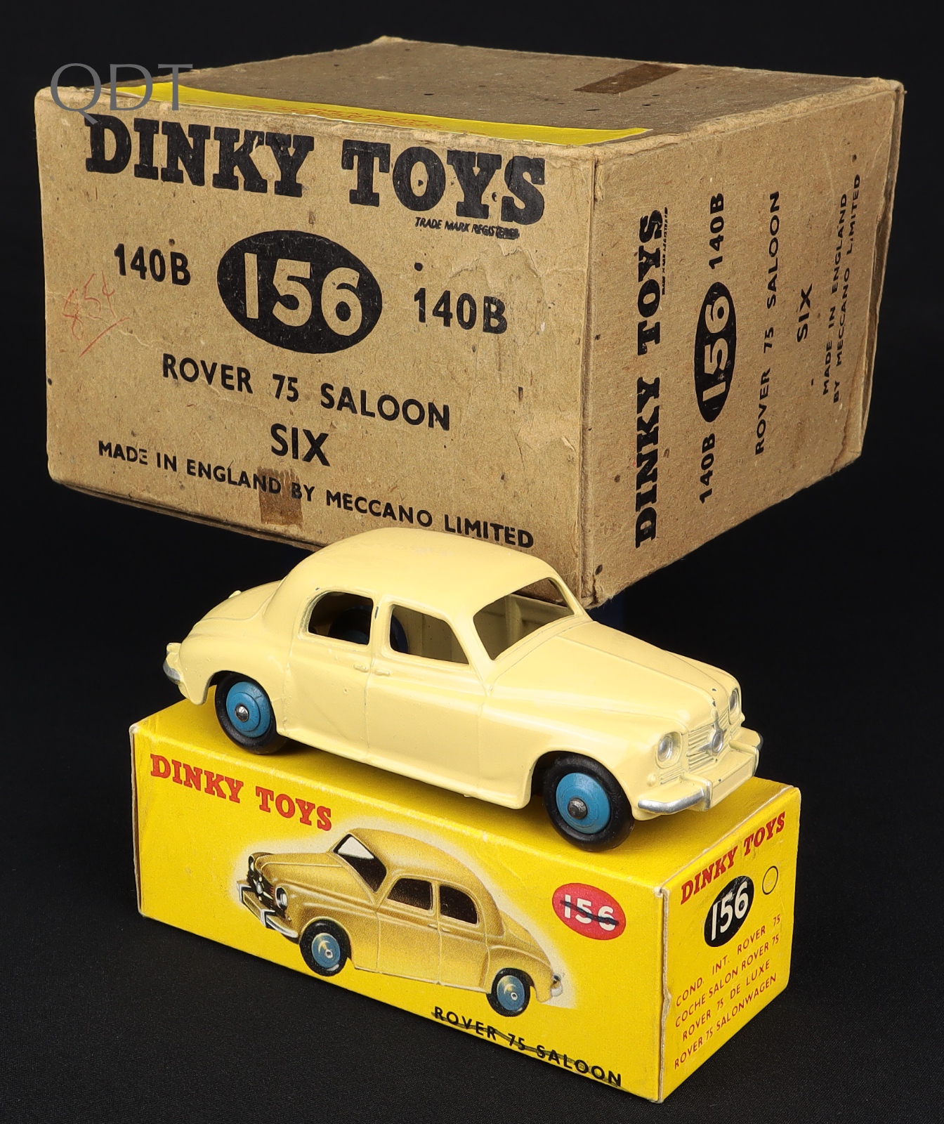 Rover 75 Saloon by Dinky Toys, No. 140B 156 in Dinky shopkeeper's Trade Carton. With U.S. Export Label. Cream with blue wheels. Scarce. Very near mint/boxed (with this version pictured). Early 156 issue from 1954. From The esteemed Spa-Francorchamps Collection. QDT starting bid £200. Please note that QDT apply 12.5% buyer's commission.