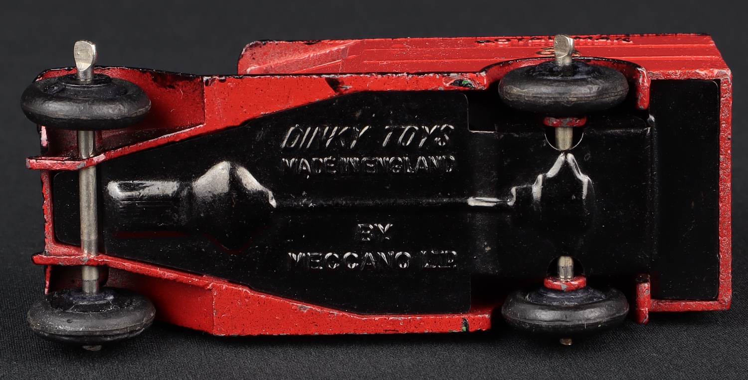 Red version with black bonnet, roof and wings and with black ridged wheels, silver trim & a filled in rear window. Smooth tyres are well-shaped. Very near mint.