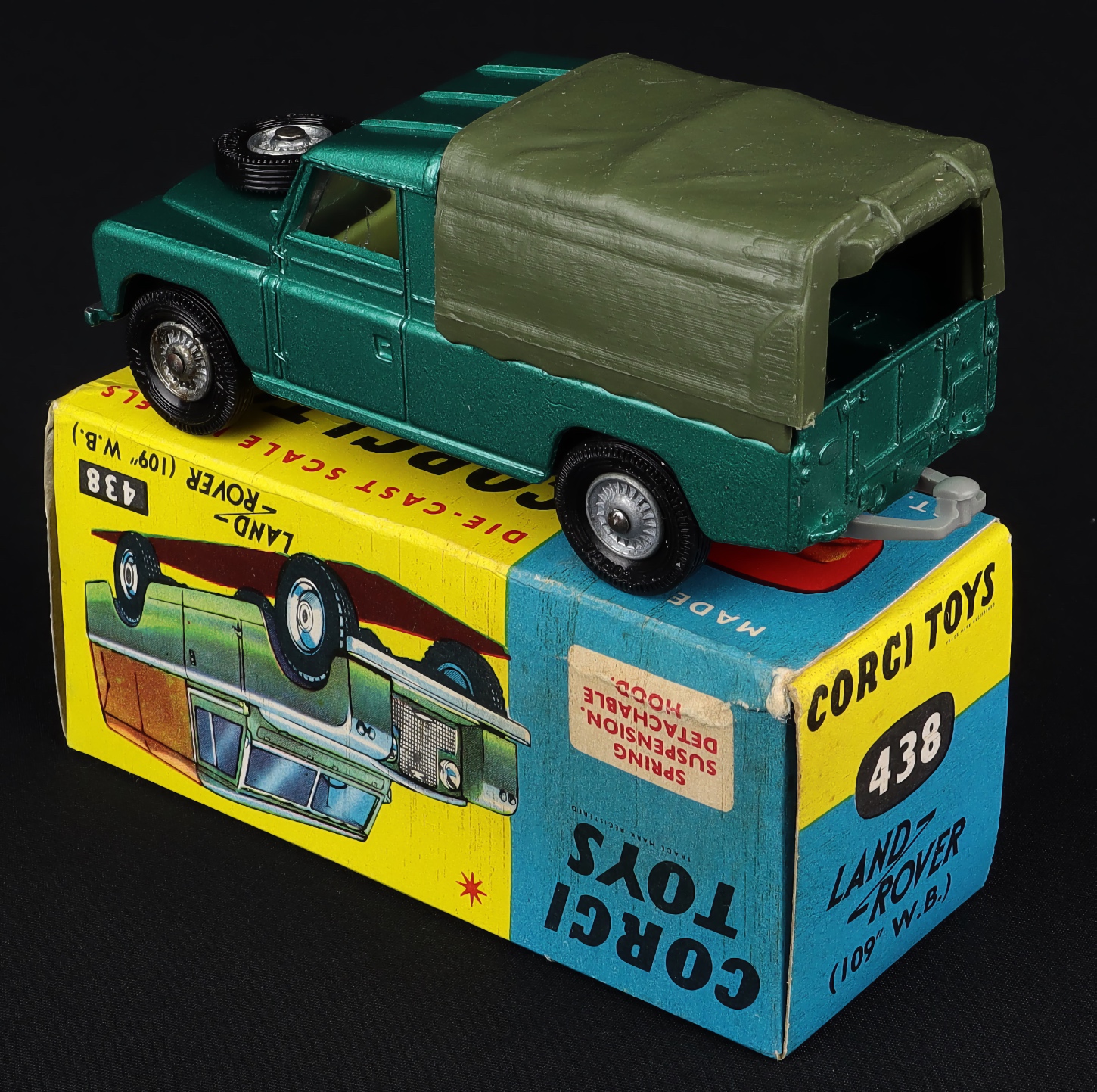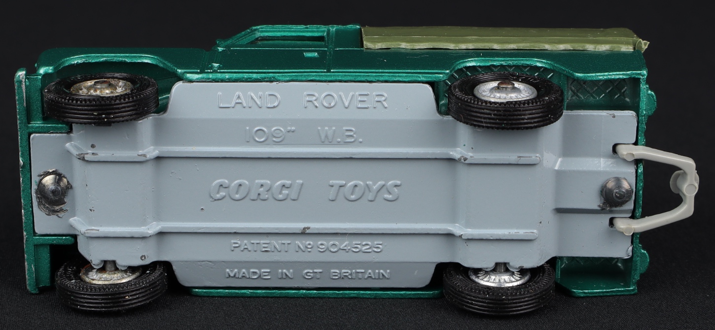 Landrover by Corgi Toys, No. 438. Very, very near mint/boxed. Metallic green with olive green canopy. Cast wheels & late nylon tyres with Corgi Toys embossed. Nice box (small crumple).
