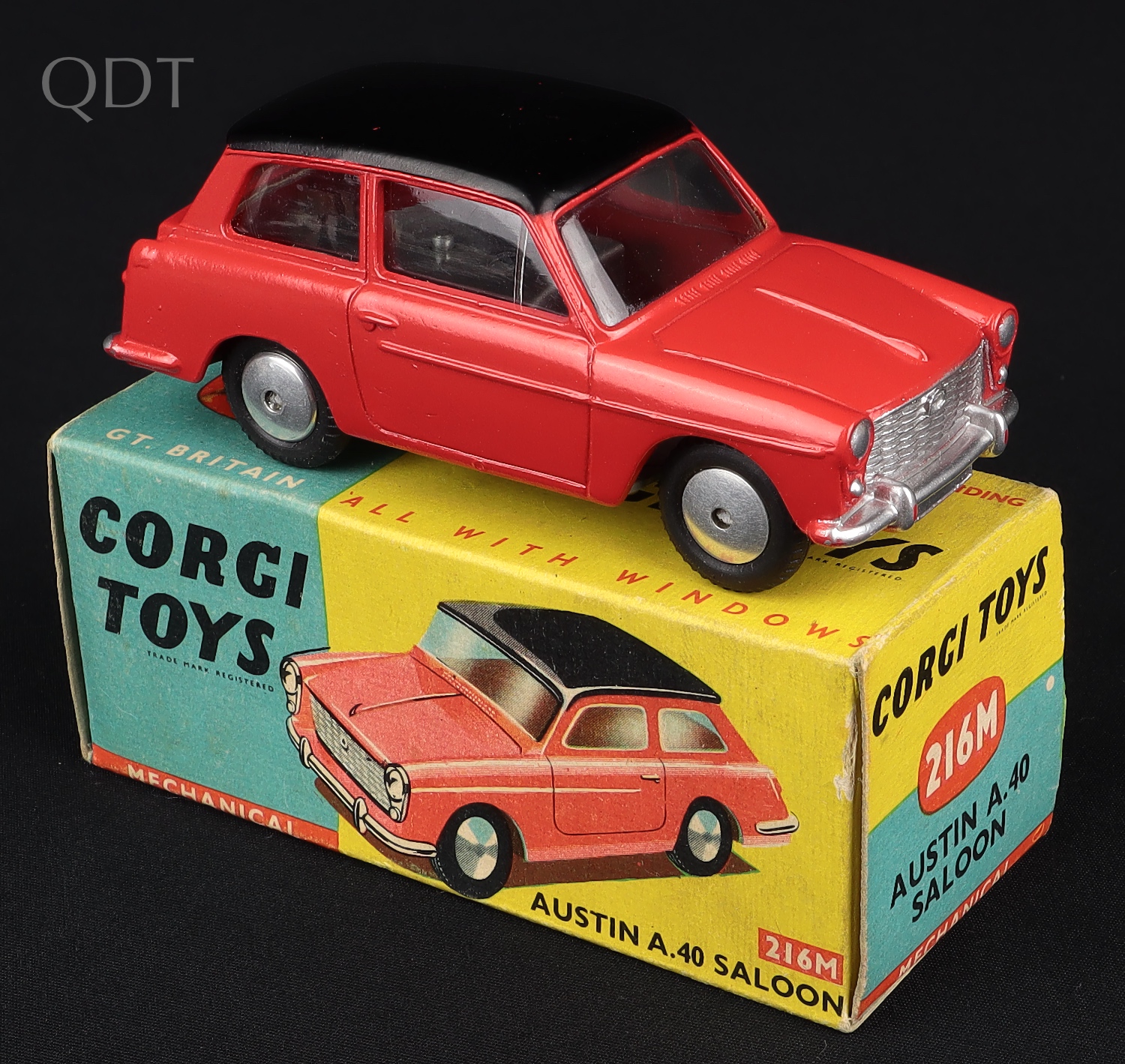 Austin A40 Saloon by Corgi Toys, No. 216M. Mechanical version, in red & black. Scarce! Near mint plus/boxed. From The Elmer Collection.