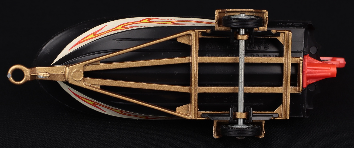 This particular version has blue screens. With bright and fresh complete paper labels on both sides, both seated figures of Batman and Robin and an attractive, beautifully detailed tinplate fin (later issues were plastic). Dashboard chrome has a couple of areas of ‘flaking’. Bright gold trailer with detailed cast wheels.