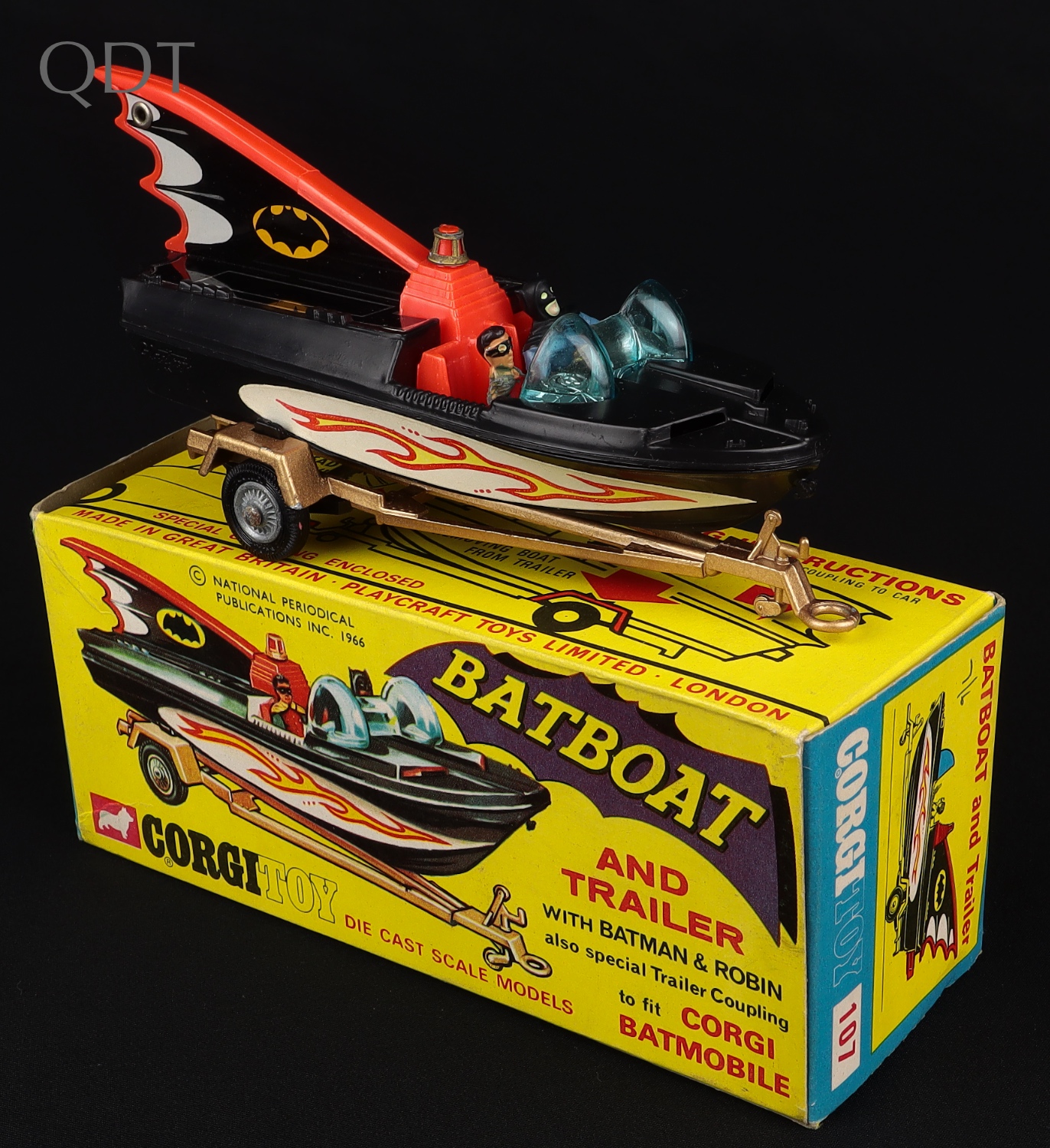 Batboat by Corgi Toys, No. 107. Early 'tin fin' issue. Blue screens. Very near mint/boxed. From The Elmer Collection.