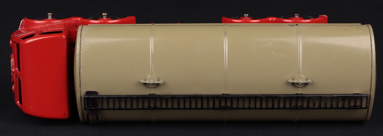 An all original example of this popular Dinky model, issued between 1948-52. This is the first issue from 1948 presented in the earliest buff box, the model is marked ‘Supertoys’ on the base. Vivid red cab and chassis, fawn tank and silver flash, 20 mph sign at rear, tinplate ladders.