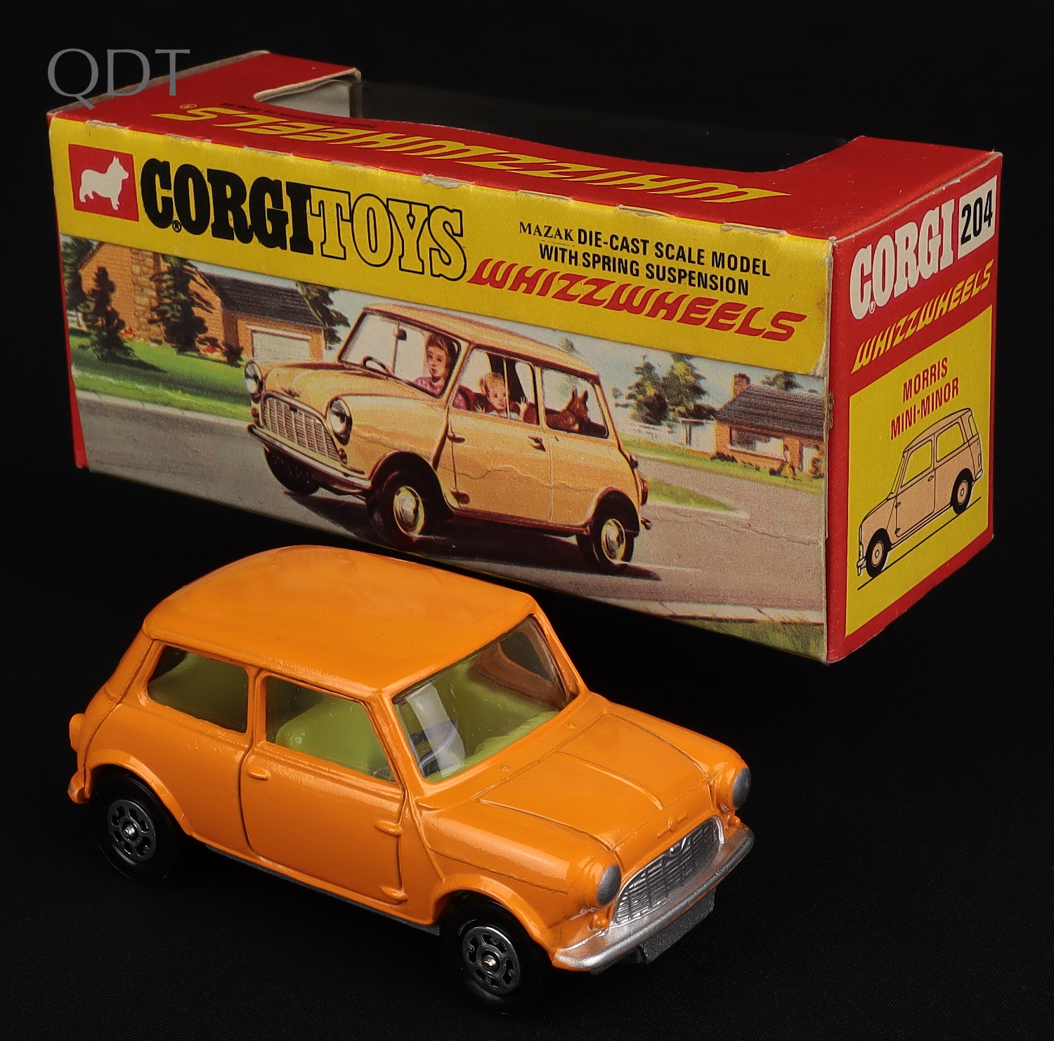 Morris Mini Minor by Corgi Toys, No. 204. Orange with yellow interior. Clear screens. Scarce. Very, very near mint/boxed. From The Elmer Collection.