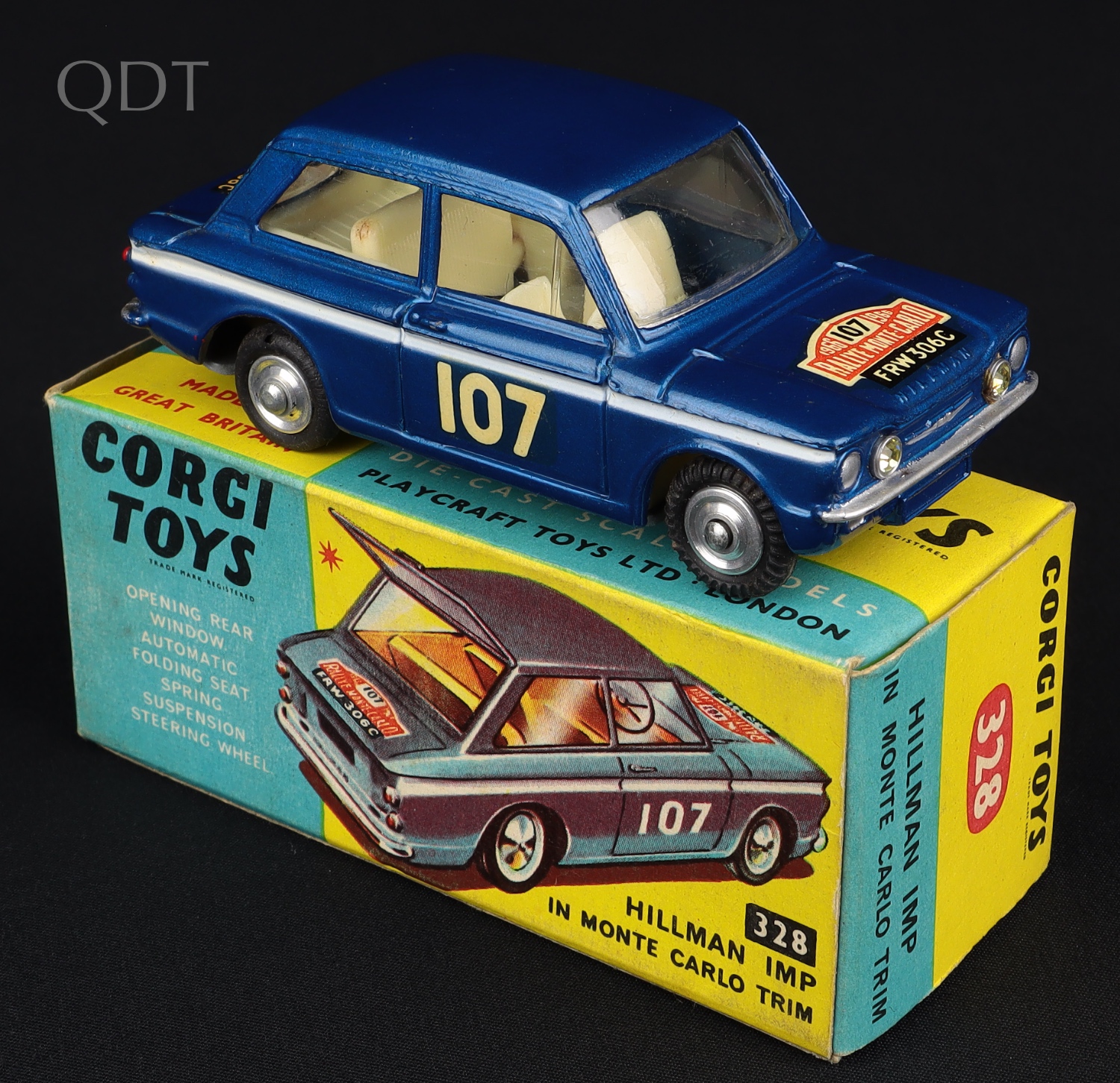 This Monte Carlo Rally Car has a metallic blue finish with a cream interior, notably intact suspension on shaped spun wheels. Complete racing number ‘107’ on both doors, as well as the Monte Carlo labels at the front. Very small edge nick to the rear transfer.